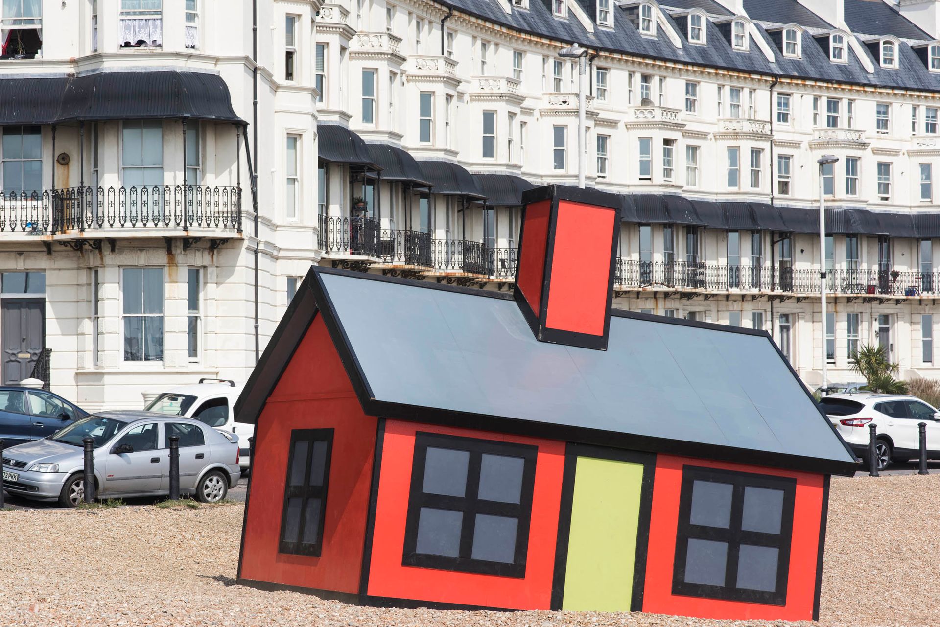 Richard Woods has installed six houses at different sites in Folkestone for his multi-part piece called Holiday Home, highlighting the housing crisis in the southeast of England. But Woods’ work touches upon other pertinent contemporary issues. “No site is too small for a second home, or holiday home,” Biggs says. “These residences are in the most unlikely places, and developers are unscrupulous in promoting the benefits of any location.” It is impossible to avoid one of the houses that bobs on the surface of the sea, just inside the harbour walls.