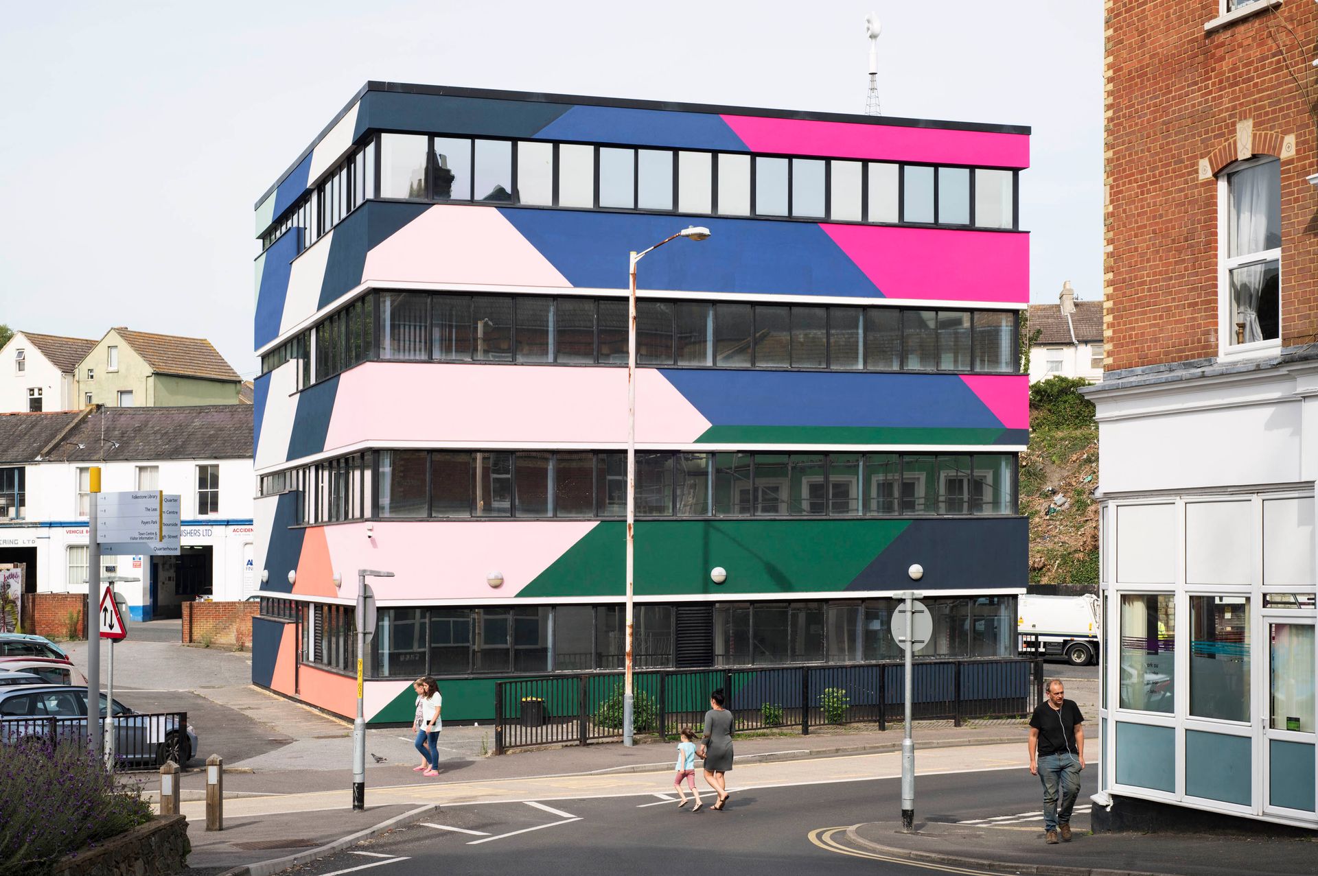 Balinese-bornSintaTantra has wrapped The Cube building with bold abstract forms, looking to the early 20th-century artist Sonia Delaunay for guidance (the circles flanking one side of the building are based on Delaunay’s fluid colour patterns). “I wanted to extend my visual vocabulary; working with the Brutalist quality of the building was challenging,” she says. A 1947 rail travel poster publicising Folkestone also fuelled Tantra’s vision. “I wanted to inject some of that [advert’s] romance into the intervention,” Tantra adds.