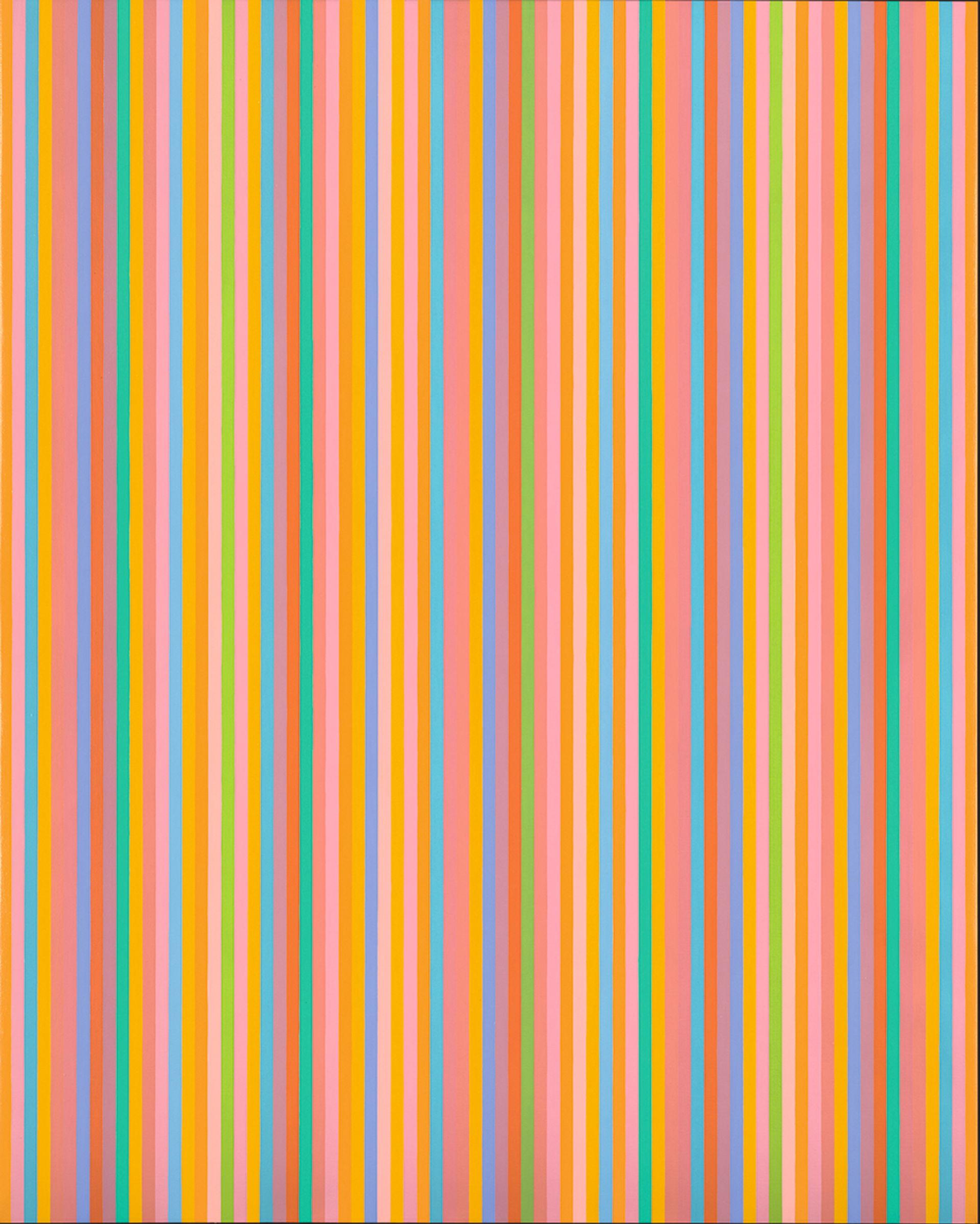 Riley’s art engages what escapes the notice of history. I know of no other examples of abstract art that quite match hers in independence from a lineage of developing aesthetic practice, its cultural allegiances, and its strategic swerves. Many late 20th-century artists have made stripe paintings, but none reaches the degree of chromatic intensity and visual surprise that characterises Late Morning 1 (1967), Serenissima (1982) or Aria (2012), all of which generate phantom colours that we perceive along with the colours materially placed on the canvas. Riley’s art induces phenomena as her paint collaborates with light and the physics of nature. The reds, greens, and blues of Late Morning 1 give rise to an aura of yellow that appears, disappears and appears again as the field of the painting vibrates with internal energy. Other works, somewhat more complicated, also involve colours we see yet cannot locate. Along with its predecessor Vapor (1970), Vapor 2 (2009) twists three chromatic grays round each other to form vertical bands, each an amalgam of off-green, off-violet, and off-orange. Riley notes that much of the perceived colour "is not actually painted. It emerges solely through visual fusion." Critics are reduced—or perhaps elevated—to describing her art in simple admiration.
