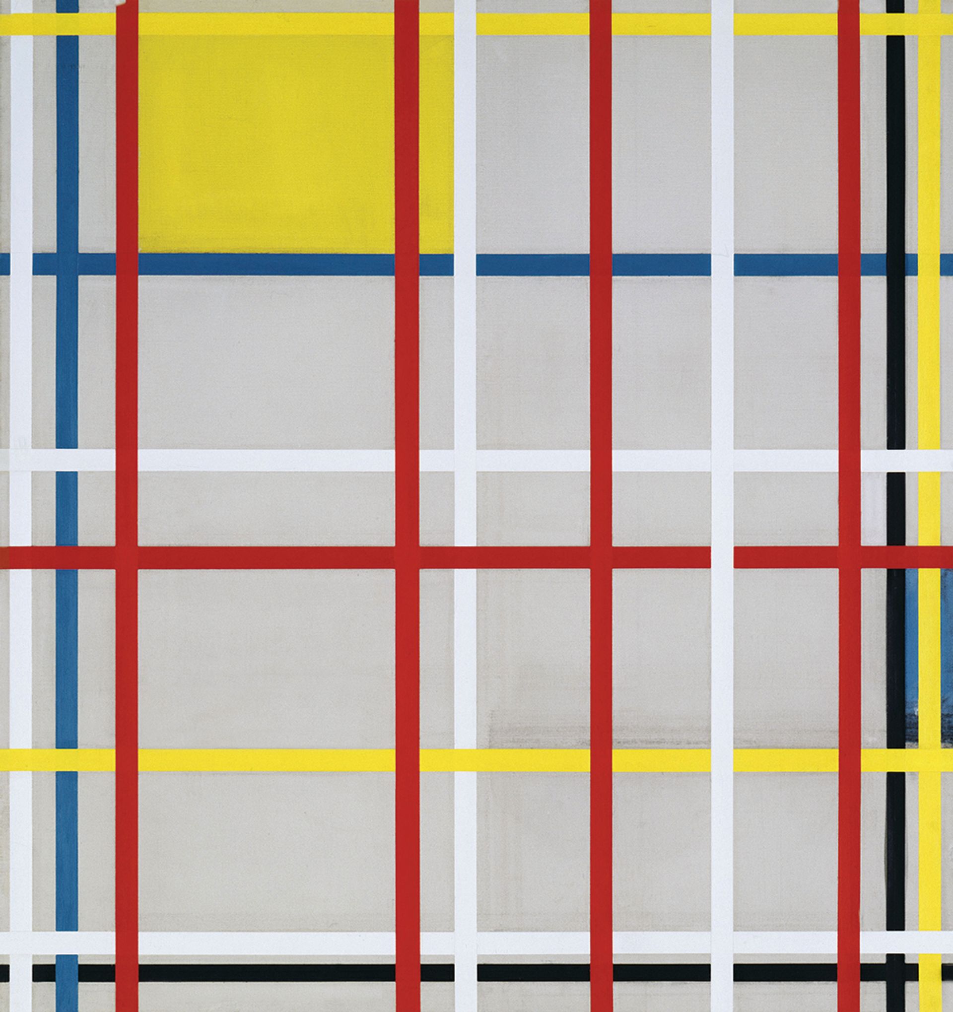 New York afforded Mondrian an opportunity to fundamentally restructure his thinking. It was here, after settling into a Midtown Manhattan studio, that he began to reassess 17 of his European pictures, among them his best works, such as Trafalgar Square (begun 1939) and Place de la Concorde (begun 1938). These were clear, open, lively and neatly layered paintings, already successful according to his ideals at the time, yet Mondrian felt that they could not stand up to New York. They needed still more dynamism, an even less obvious sense of underlying stability and a crisper staccato pop. His solution was not excessive. With a few small, unbound bars of red, yellow and blue—finally freed from the constraints of black lines, allowed to float up to the surface of the picture plane—he broke open a new line of development.