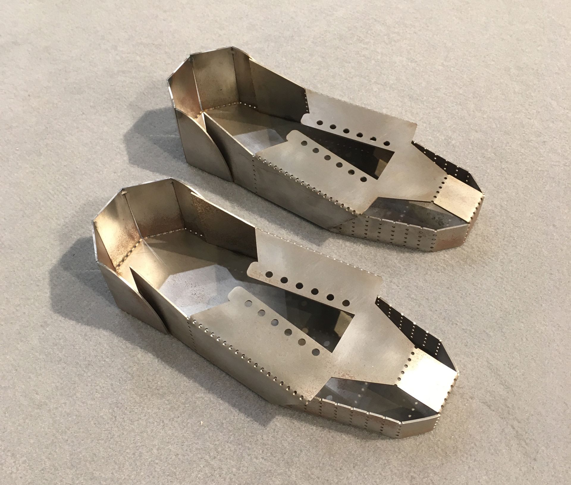 Forget Christian Louboutin: invest in a pair of Tessa Lynch’s shoes, shaped from a flat piece of steel. The Glasgow-based artist says that “the coupling series started from mimicking things I saw day-to-day that held things together”. She adds that she “started with industrial fixings but then this drifted into a more domestic setting, mainly because I now work mainly from home, juggling art-making with childcare”.