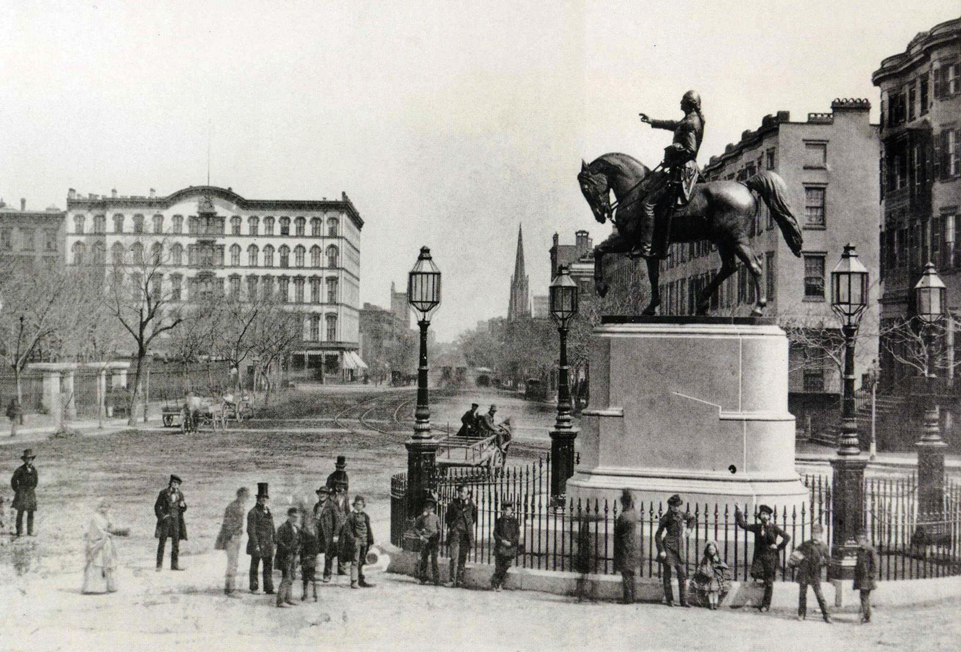 Having come from Rome, Brown looked back to Marcus Aurelius for what was going to be the definitive American monument. So there’s the absurdity in trying to put Washington on the same footing as the heroes of Europe, ancient and modern, but instead of representing him in a toga or classicised drapery, as was the tendency at the time, Brown showed the commander in chief dressed in uniform. And even though it is an equestrian monument, Washington is represented as a man of the people because his hat is off in deference to his public.