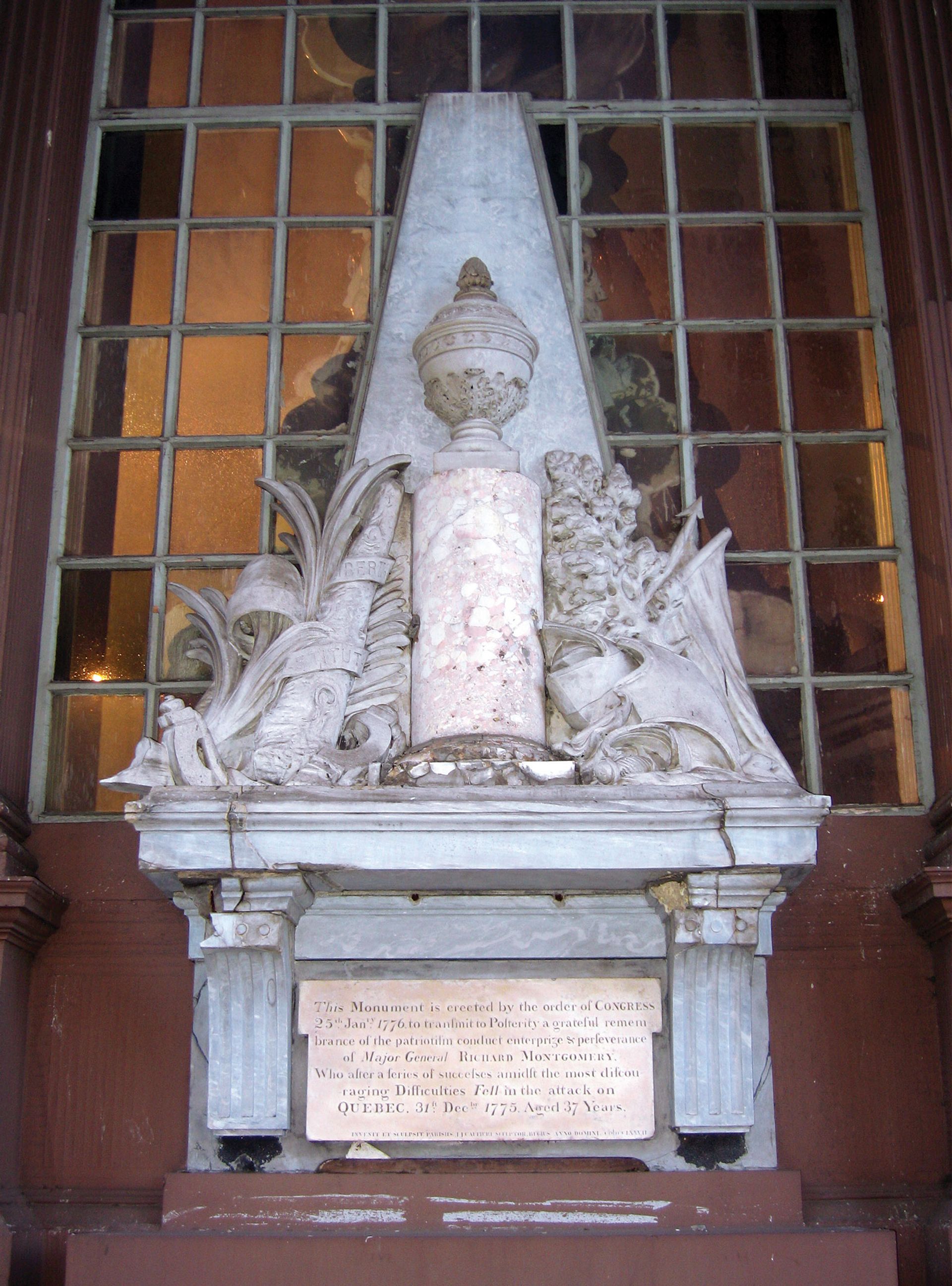 Commissioned during the American Revolution, the Montgomery Memorial established a tradition in the US for the commemoration of heroes. The Continental Congress—the representatives from the 13 colonies that became the US government—gave £300 to Benjamin Franklin, the new ambassador to France, to commission a work in honour of General Richard Montgomery. And while the sculpture starts an American tradition, it is by a European artist, Jean-Jacques Caffieri, because there were no artists here—that is how young a country we were.