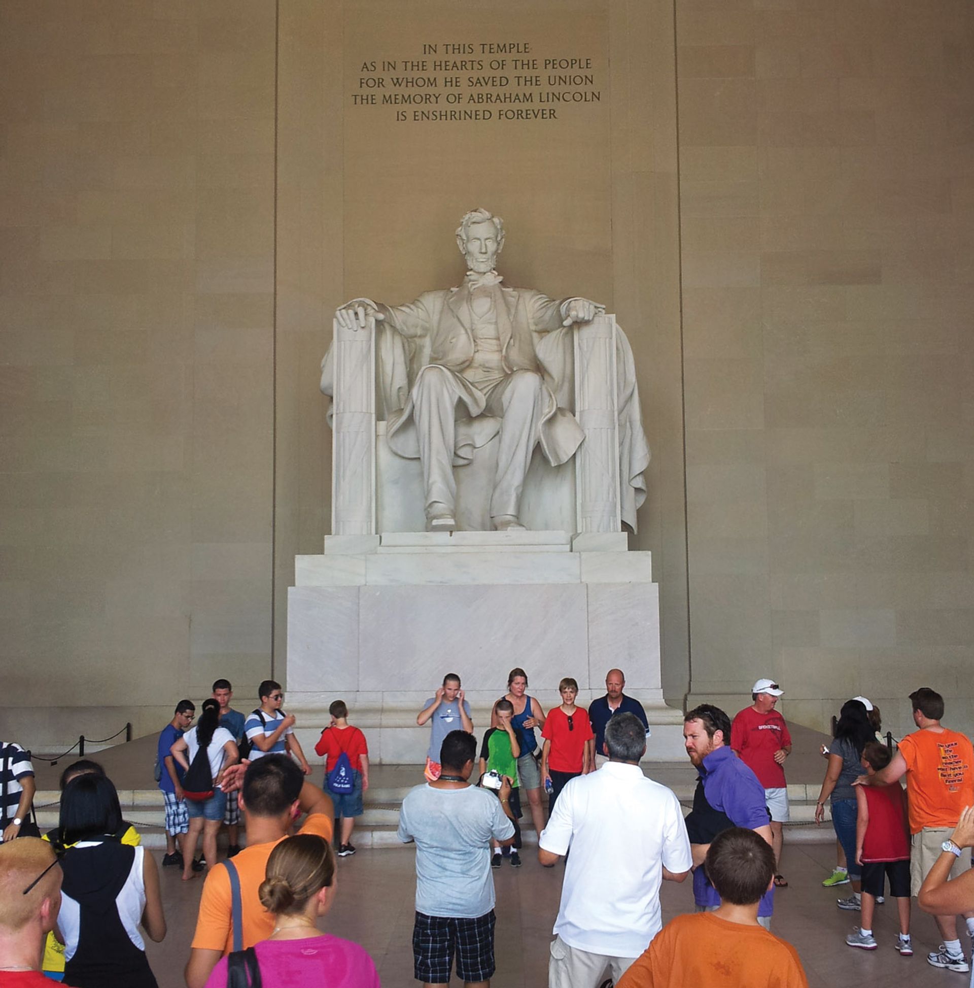 The sculpture is truly colossal: 19 feet high. It’s a triumph of revision, because it was originally contracted to be just over half that. Fortunately, the architect Henry Bacon and the sculptor did several tests with plaster enlargements and photographs and determined that the scale would not work as originally conceived. The seated position is a happy accident of circumstances, artistic and political. An equestrian statue was out of the question: Lincoln was not known for his riding skills—whenever he sat on a horse, his legs tended to dangle very low to the ground, so he’d look ridiculous. Originally it was all but assumed he would be standing, but French had already done a standing figure in Nebraska, and his friend and rival Augustus Saint-Gaudens had done a standing Lincoln for Chicago. French also believed that Lincoln looked less dignified standing: he had very long legs and was indifferent about how he wore his clothes. He thought having him in a chair of state would communicate something different.