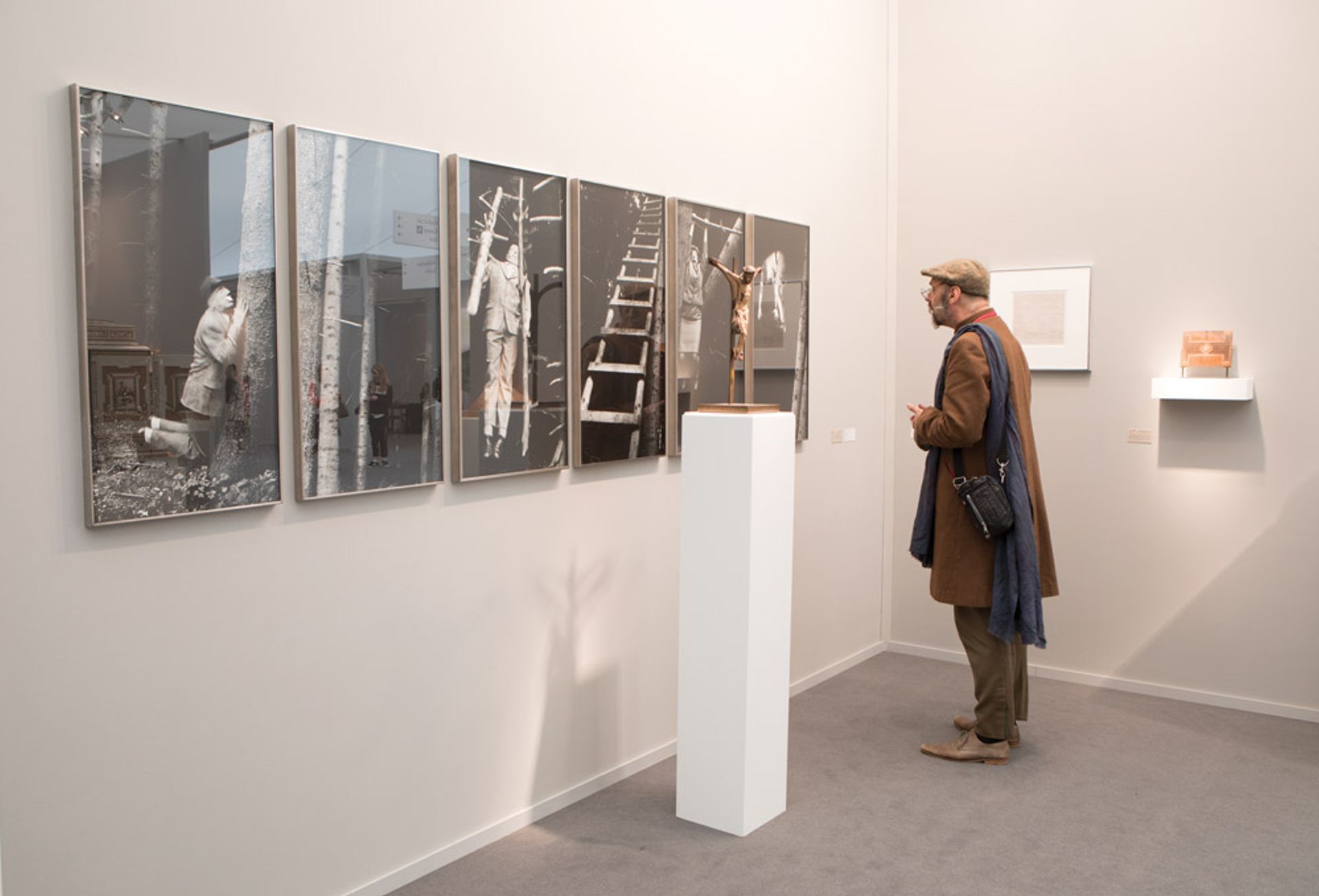 The German photographers Anna and Bernhard Blume studied at the Staatliche Kunstakademie Düsseldorf in the 1960s and first exhibited their joint work at Documenta VI in 1977. For 30 years, until Bernhard’s death in 2011, they staged large, darkly humorous black-and-white photographic sequences of bourgeois domesticity gone awry. In a world where objects take on a threatening life of their own, religion—a recurring motif for the Blumes—seems to offer little salvation. Exhibited on the shared booth of Peter Freeman and Kunstkammer Georg Laue, this work is paired with a rare Tuscan polychrome wood crucifix (around 1380).