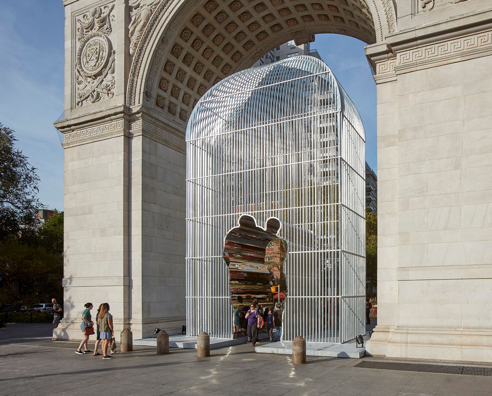 Some works have been mounted on bus stops, flagpoles and in the gaps between buildings, while 18 monumental sculptures can be found in Washington Square Park, the Doris C. Freedman Plaza of Central Park and Flushing Meadows Corona Park, among other open spaces. At the Cooper Union, the artist installed metal bars on five colossal windows of the school’s science and arts building and hinted that he might permanently donate the installation to the school.