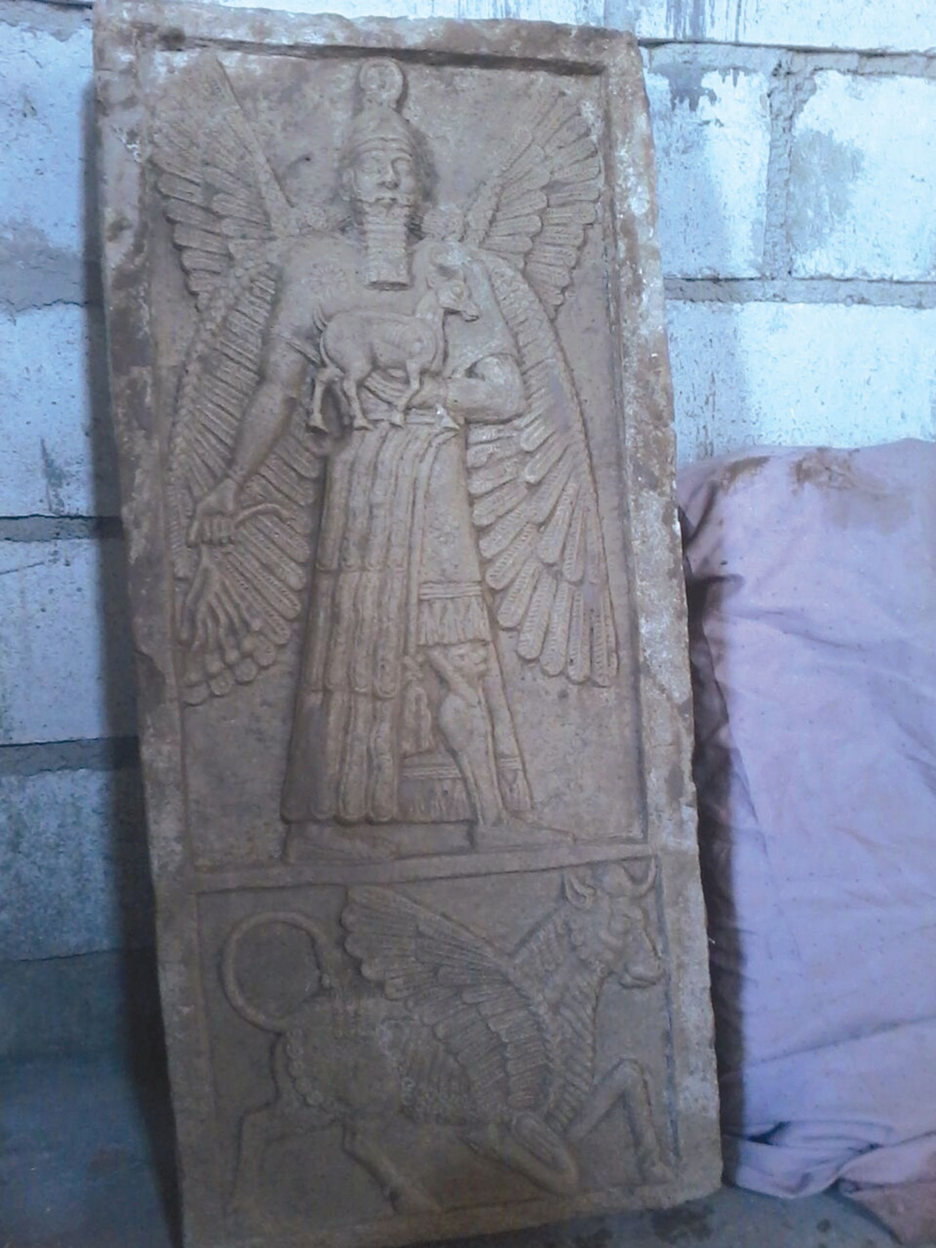 This was the case for a winged genius, which was reported by the WSJ as being offered for sale by an IS official for $200,000, who claimed it was excavated from a site in North-east Syria. The claim looks highly doubtful: according to APSA, the feet and legs are copied from a deity in profile, from a palace in Nimrud, while the head and torso are frontal, and copied from another figure from Tell Ajajah.