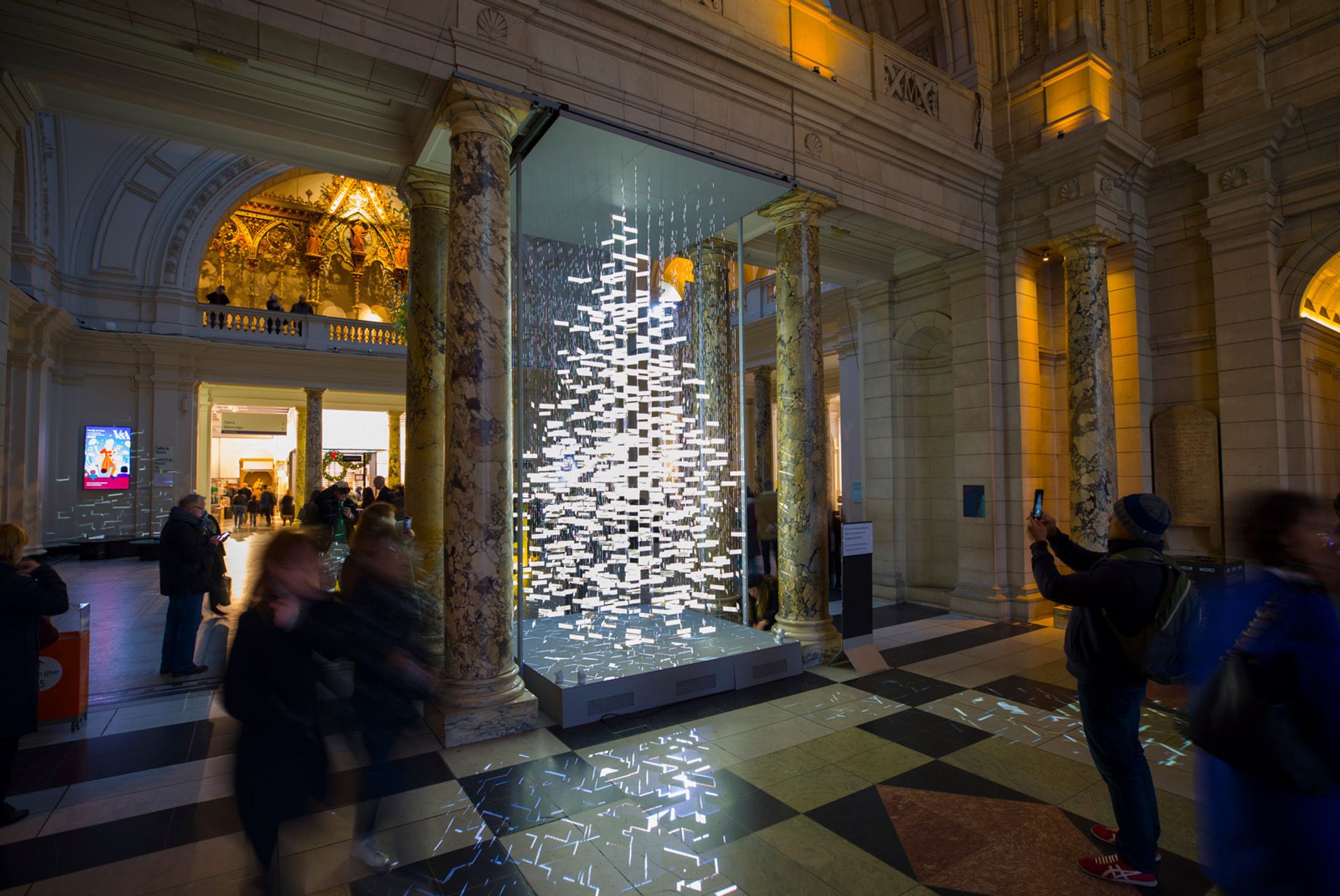 Located in the Cromwell Road entrance of the Victoria and Albert Museum, The Singing Tree incorporates a thousand planks of birch plywood and threaded together to make a tree shape. The artist invites members of the public to suggest words that are randomly projected onto the planks of wood through algorithms. Victoria and Albert Museum, London