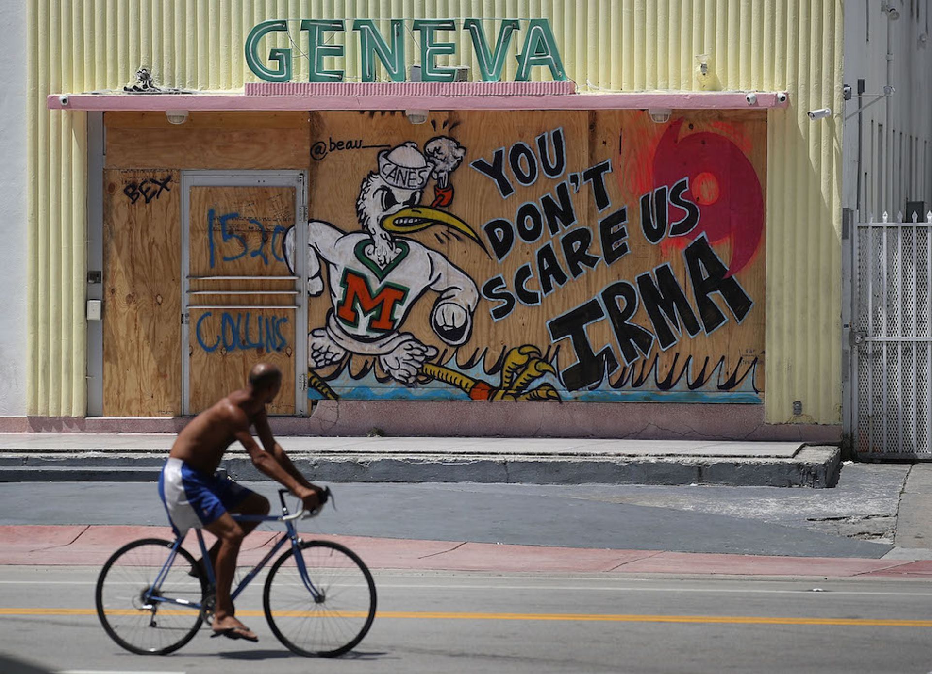 A message reading "You Don't Scare Us Irma" is written on plywood being used to cover the windows of a building as people prepare for the arrival of Hurricane Irma on September 8, 2017 in Miami Beach, Florida. Florida appears to be in the path of the Hurricane which may come ashore at category 4. Joe Raedle/Getty