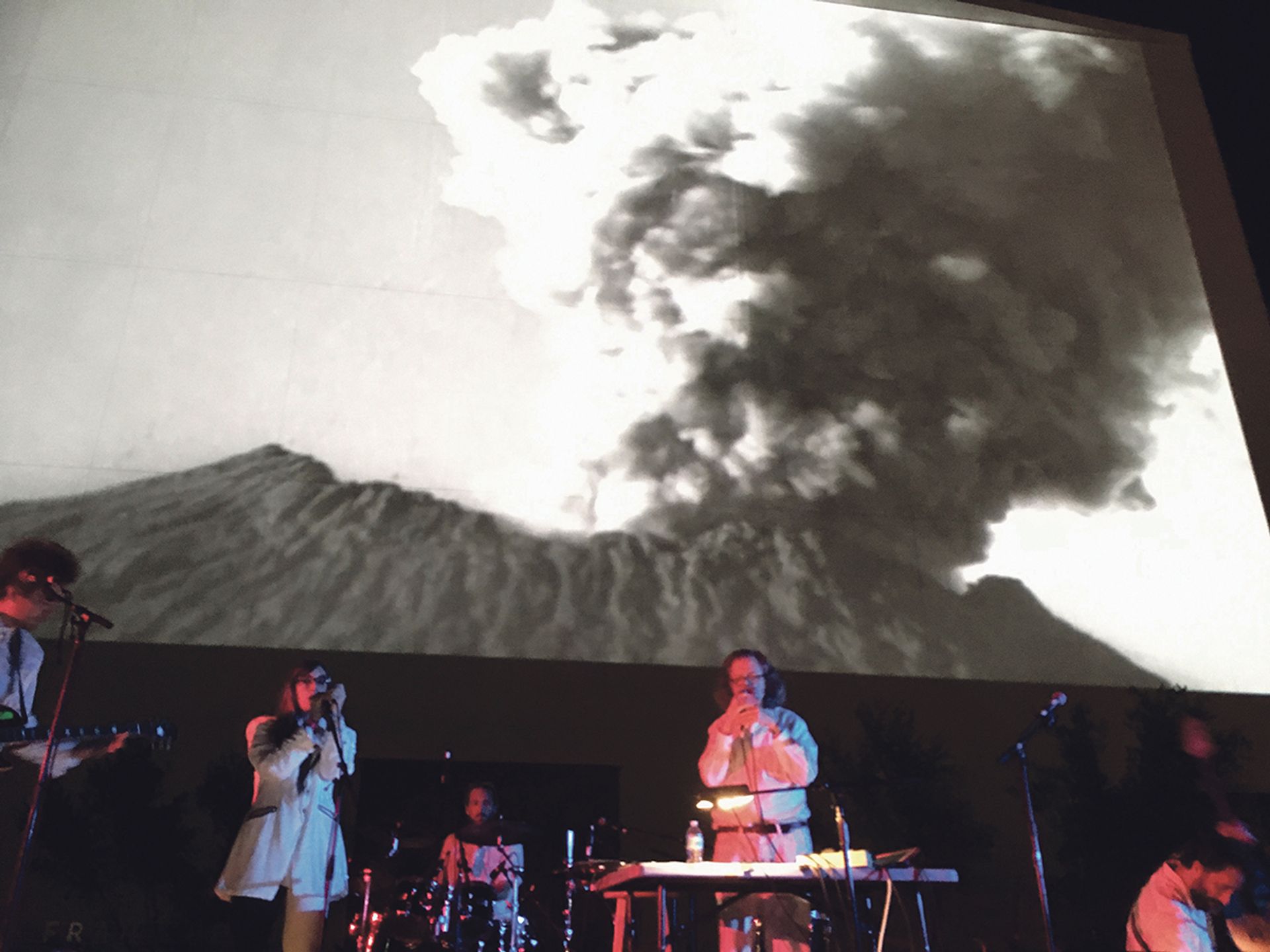 Jim Shaw and his band perform against the background of an erupting volcano Louisa Buck