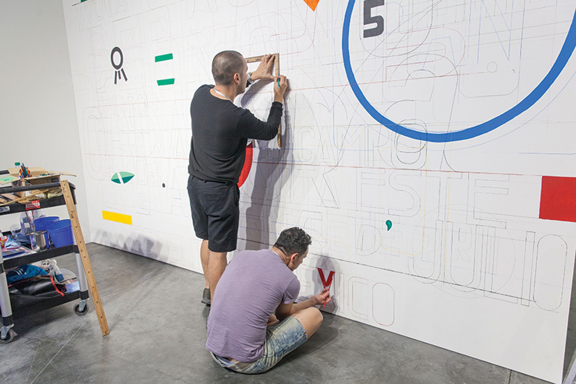On the stand of the Mexico City-based gallery Proyectos Monclova, the duo Tercerunquinto (Gabriel Cázares and Rolando Flores) are working on a large-scale wall painting throughout the fair. It is part of an ongoing project, begun in 2009, called Restauración de una pintura mural, which grapples with politics, urbanism and memory.
