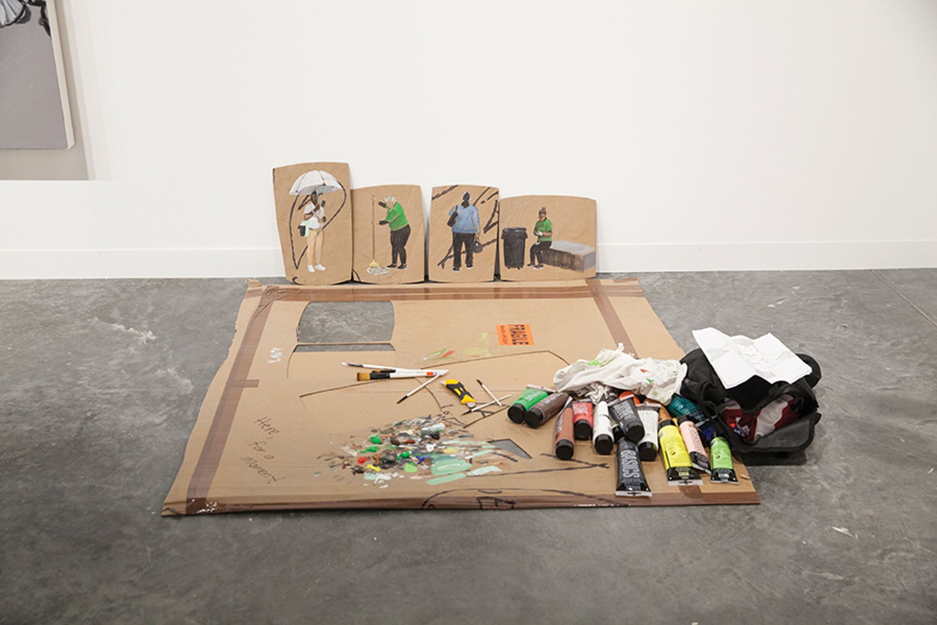 Some artists are taking matters into their own hands. The California-born artist Ramiro Gomez has paintings on cardboard hanging on the wall at P.P.O.W gallery, but the artist—the son of a janitor and a truck driver, both immigrants—felt that his presence was also necessary, via a project he titled Just For You. After gathering up boxes discarded after the fair’s installation, he set up a “studio” in one corner of the stand and is painting small portraits on cardboard of maintenance workers at the fair. “It’s devoted to all the labour happening here,” he says. Gomez is giving the portraits to his subjects, for free.