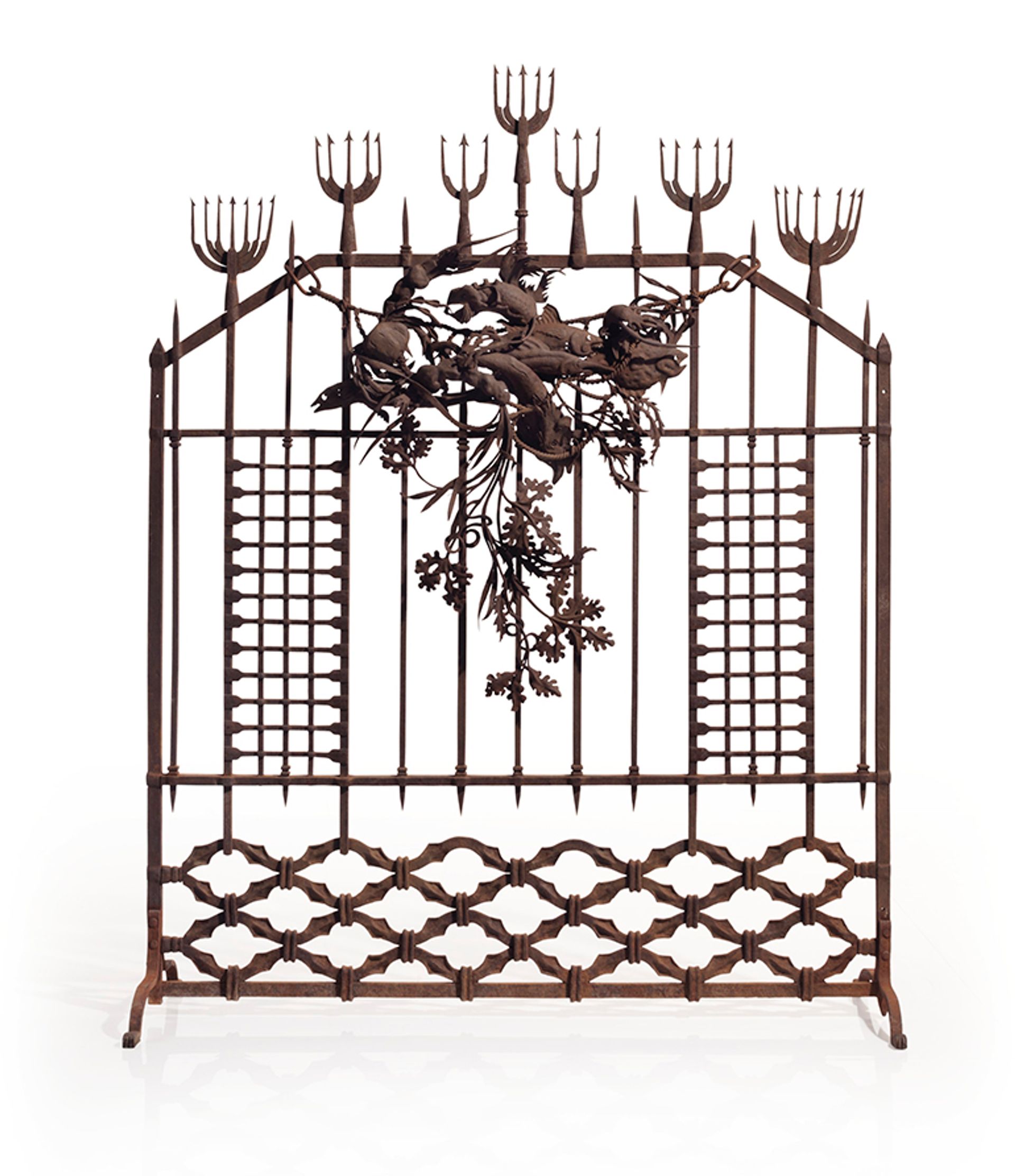 This wrought-iron gate was designed by the late Italian artist for the 1924 Venice Biennale, the only time that it was shown in public. The Venetian designer inherited his family’s blacksmithing business as a teenager and, through self-guided experimentation, became known for eccentric works that combine contrasting elements, like traditional ironwork with organic forms and other materials. Bellotto was first widely recognised at the 1914 Venice Biennale, where he presented a series of eclectic works that paired iron with materials like ceramics, glass and leather. This piece, which employs motifs like fish and tridents, shows him taking inspiration from the traditional Venetian theme of the sea, extending even into his formal achievements in capturing the fluidity of water in hard iron. Shortly thereafter, he shifted his focus to glass. Works by Bellotto are held in major collections, including the Murano Glass Museum in Venice, and the Cooper Hewitt, Smithsonian collection in New York.