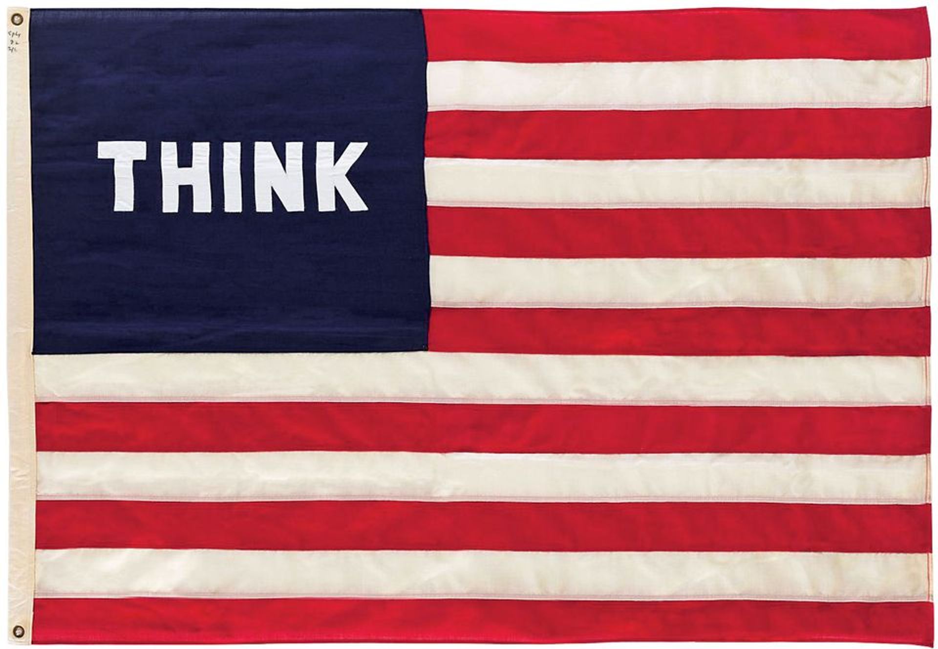 In 1972, the Surrealist artist William Copley produced Imaginary Flag for USA—a simplified version of the Stars and Stripes with the word “think” written in capitals in the top left-hand corner. It was created at one of the most turbulent times in US history, as the Vietnam War drew to a bloody close and the nation was gripped by race riots and the arrests that would soon expose the Watergate scandal.