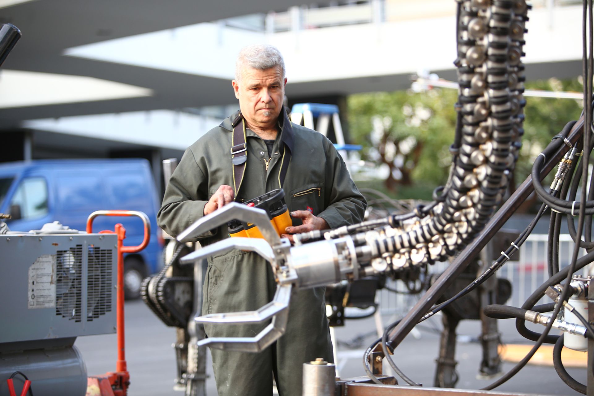 Mark Pauline with the Spine Robot (2014) Courtesy of Survival Research Laboratories