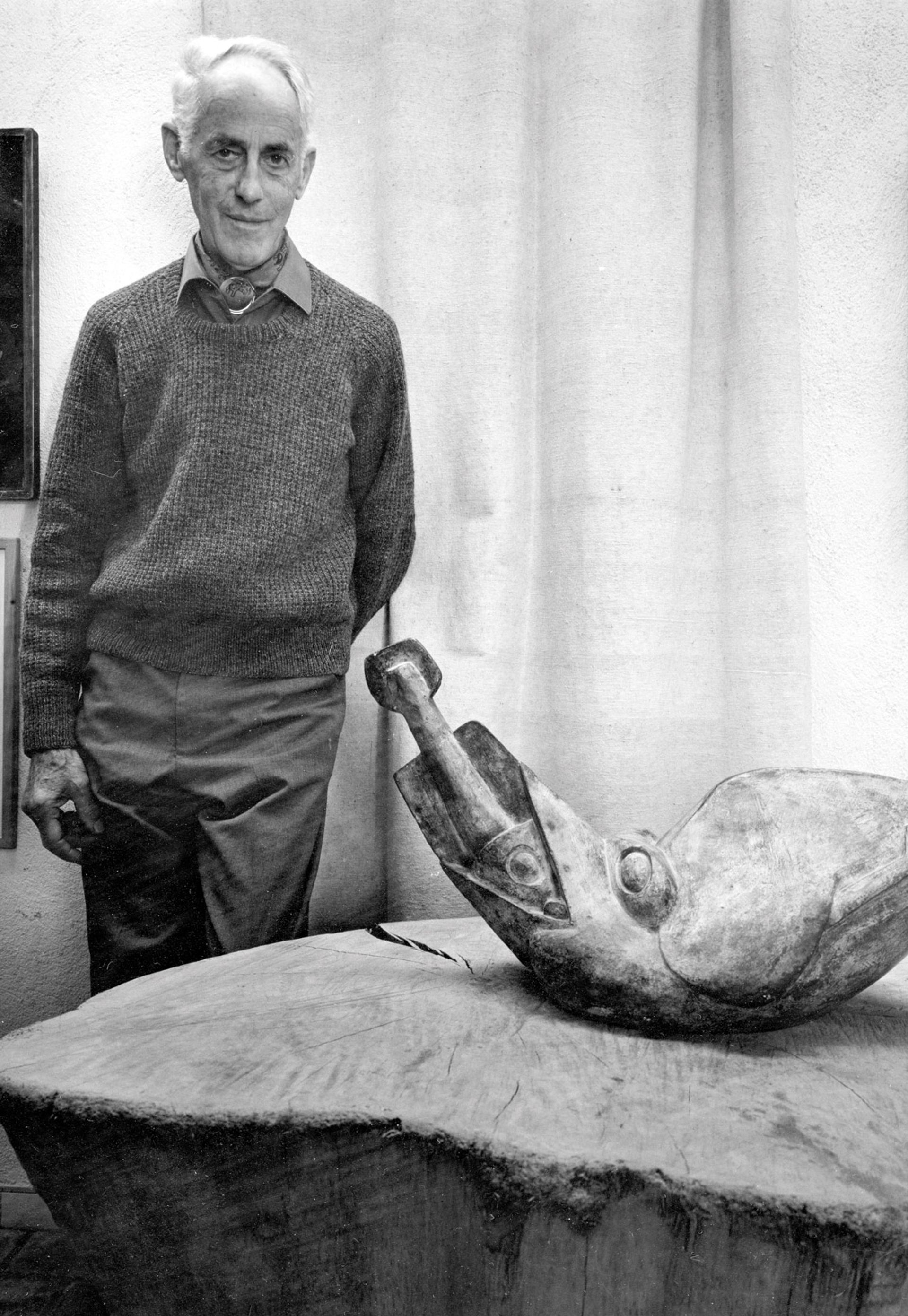 Jim Ede with Gaudier-Brzeska’s Bird Swallowing a Fish, in 1972 Kettle's Yard, Derry Moore