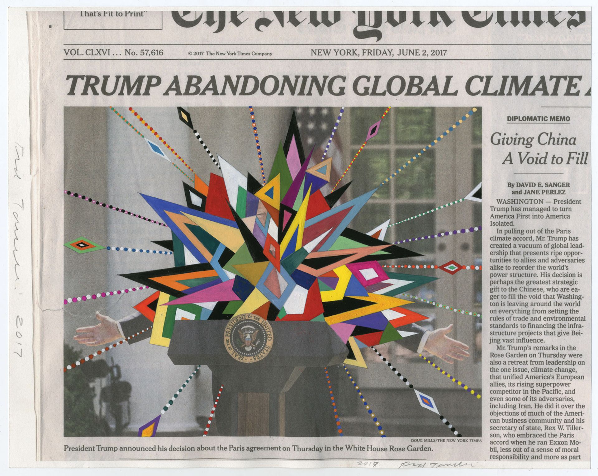 Fred Tomaselli’s June 2; 2017 (2017) features his signature use of the New York Times Courtesy of the artist and James Cohan, New York