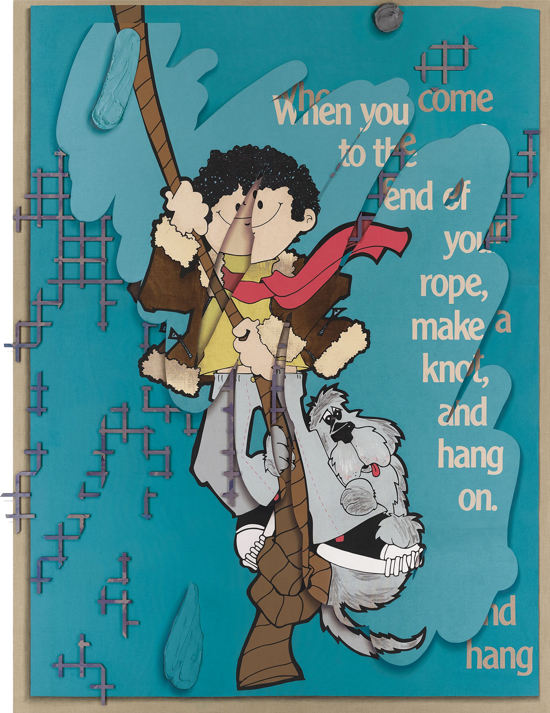 Since that relatively fallow period, Owens has gone from strength to strength. In her most recent and best works, such as a picture from 2014 of a cartoon boy and his grey dog dangling from a rope, she has discovered how to press her figurative sensibility in line with her vision for abstraction. Parts of the painting are covered in a lattice grid (one of her signature marks) that remind us of the flatness of the picture plane, which Owens has nevertheless filled with an enormous amount of space. This is a work of many layers, which she has enriched with recessive shadows, curious spatial openings and a sense of good cheer about painting that so few others know how to handle.