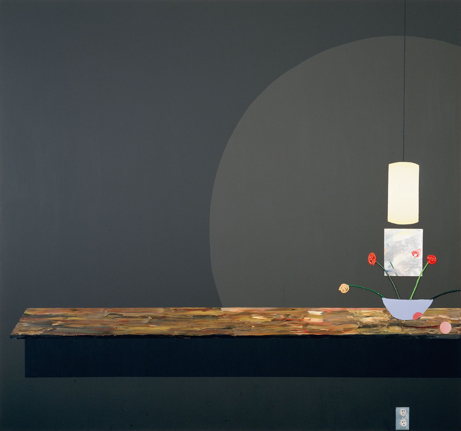 Early in her career, Owens realised she was interested in paintings about painting. For a student in Los Angeles (she graduated from the California Institute of the Arts in 1994), it was a curious enthusiasm. Long after most of her West Coast peers and teachers had given up on the theme, Owens was making pictures of pictures, as in a work from 1997 that shows two paintings hanging on a gallery wall at oblique angles. They are largely obscured through a truncated perspective, but the original version of one of the paintings depicted—a dark still-life of a bright lamp hovering over a wooden table with flowers—hangs nearby at the Whitney, reminding us of Owens’s kaleidoscopic sensibility, wherein one work is often refracted through another. (That awareness is echoes in the show’s inventive catalogue, which includes oral histories of Owens’s work through the voices of artists, writers and friends such as Chris Ofili, Rachel Kushner and Paul Schimmel. The cover of each catalogue is a unique screen print made in the artist’s studio.)
