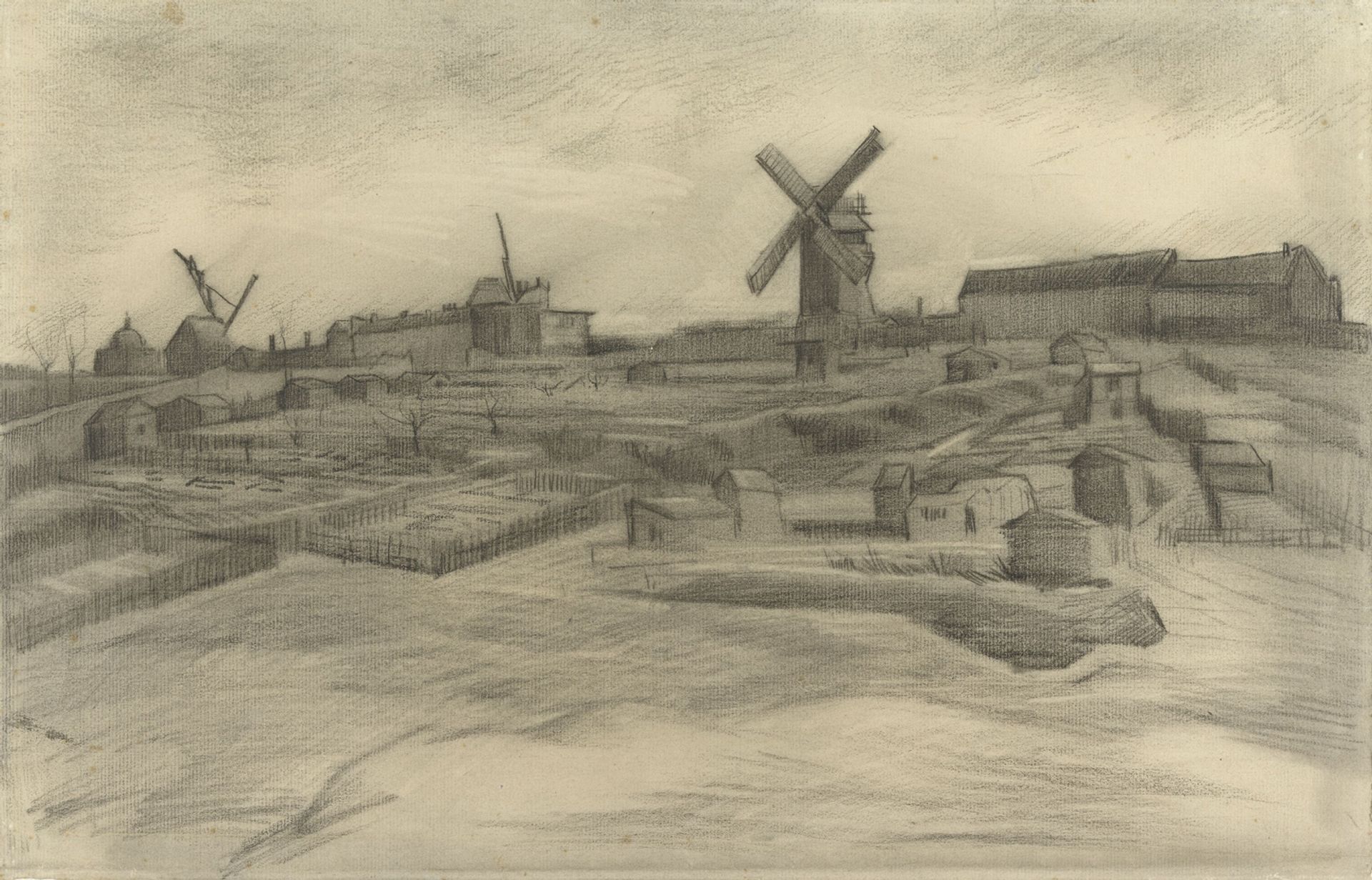 The drawing depicts windmills on top of Montmartre with a quarry below, a spot just a few minutes’ walk from the apartment that Vincent shared with his brother Theo. Sold in 1911 by Theo’s widow, Jo Bonger, to a dealer in Haarlem, the drawing disappeared until it was bought by the Van Vlissingen Art Foundation, set up by John Fentener van Vlissingen, whose wealth comes from the travel trade.