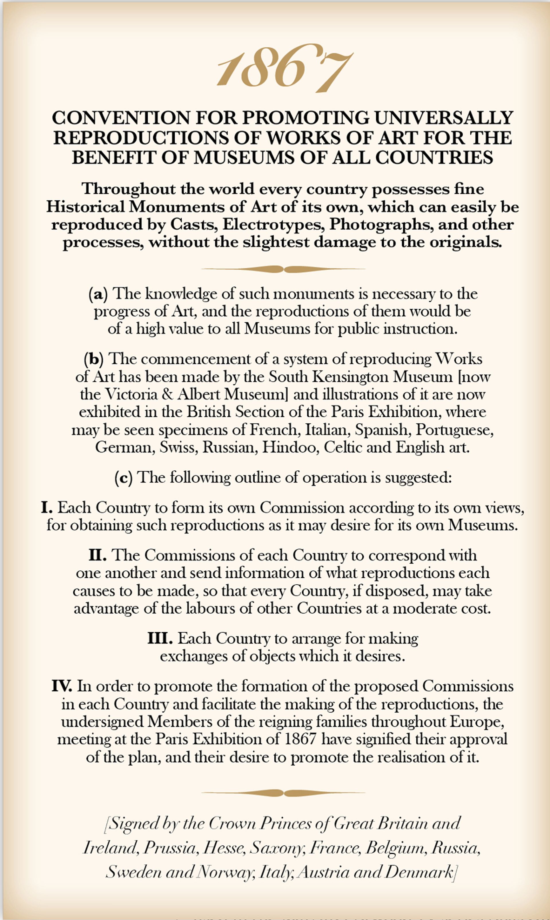 The project has evolved out of the V&A exhibition at the 2016 Venice Architecture Biennale, when the iconoclastic fury of Islamic State was at its height. Called A World of Fragile Parts, this looked at how copies could help preserve heritage at risk not just from war but climate change, tourism and simply the passage of time. The declaration is also in response to the vast possibilities offered by digital technology—ultra hi-res imagery, 3D printing, virtual reality (VR)—something in which Google Arts & Culture has given museums a crash course. It commemorates and revives the spirit of the almost forgotten but groundbreaking 1867 convention for the reproduction and sharing of works of art by means of plaster casts, photography and electrotyping, initiated by the first director of the V&A, Henry Cole (see illustration).