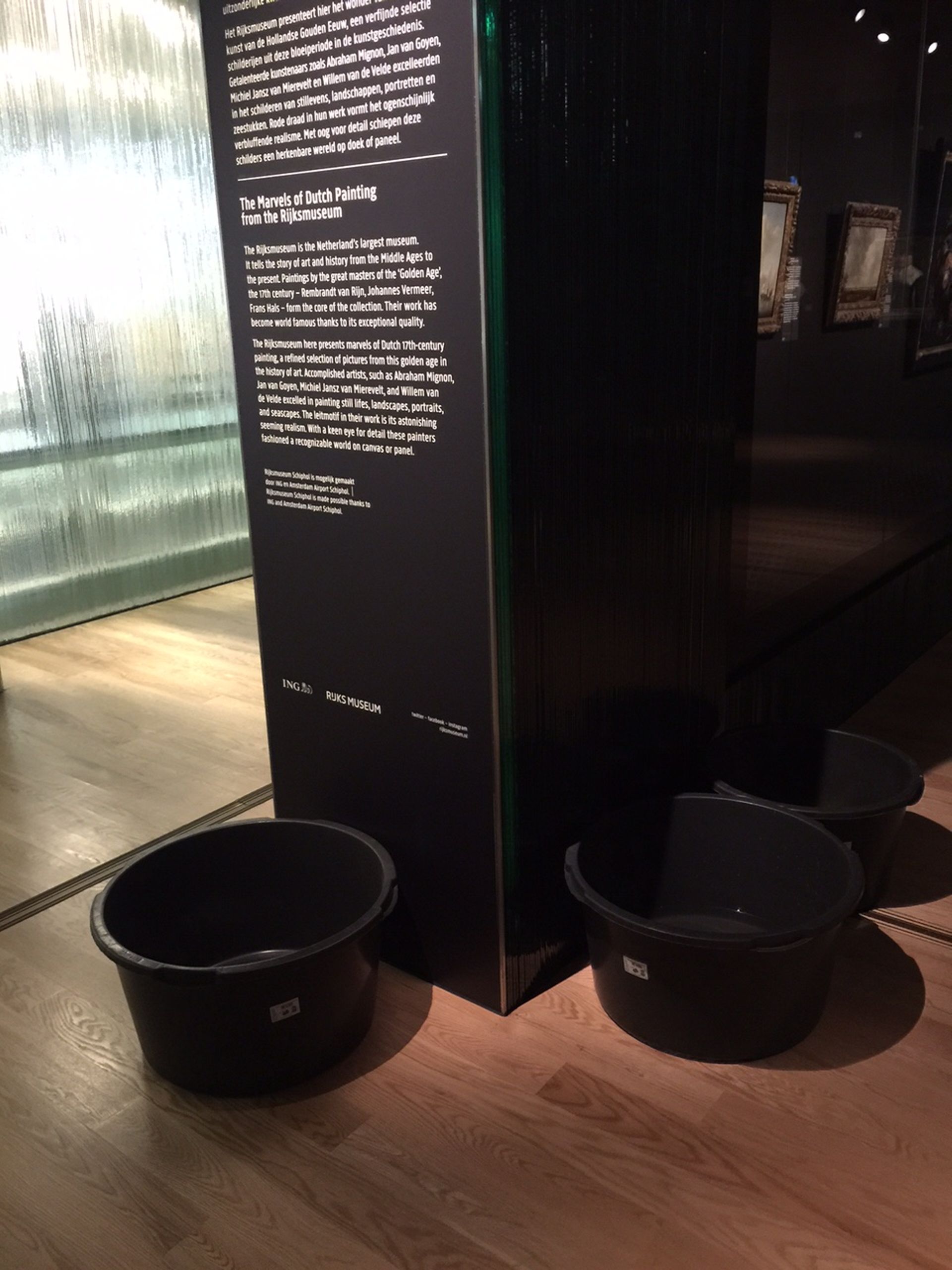 Dripping continued until last weekend. The water was caught in three large buckets, placed next to the vulnerable display case with five paintings: two panoramic landscapes by Jan van Goyen (1644), seascapes by Willem van de Velde (after 1670) and Ludolf Bakhuysen (1694) and a flower still life by Abraham Mignon (about 1670).