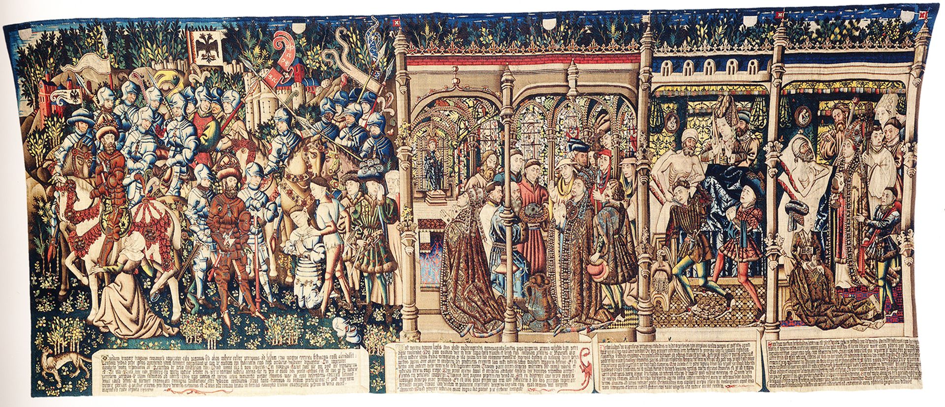 Alas, the bombardment of Brussels by French troops during the Nine Years’ War (August 13-15, 1695) and the subsequent fire that raged through the city obliterated all four of them (along with a third of the city’s buildings), and they “survive” only through numerous descriptions by visitors and writers who admired them—including Albrecht Dürer, who in 1520 made a special point of visiting city hall in order to see them—as well as several copies in drawings, paintings and tapestry. The tapestry illustrated above, now in the Historical Museum of Bern, represents the most intact and complete indication of how the paintings looked, even including inscriptions along the edges that are thought to have originally been carved into the framework of the panels.