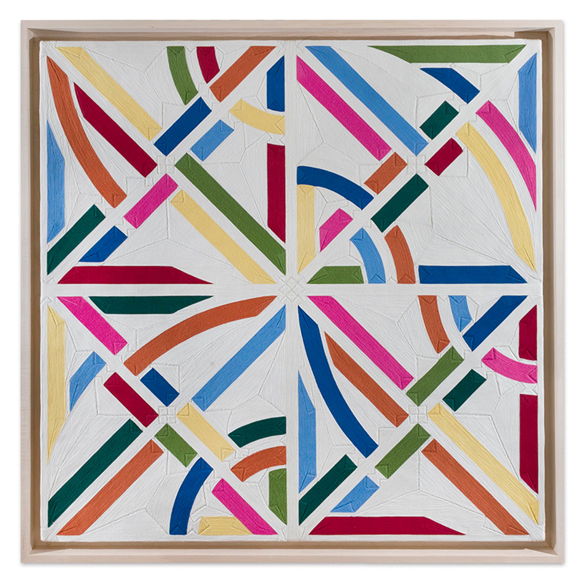 Since the 1970s, Terrazas has been refining his thinking through the project Posibilidades de una Estructura (Possibilities of a Structure), from which these new works are drawn. It is, he explains, a framework based on a circle within a square crossed by two diagonals: Cartesian forms to capture “everything that appears to you in the universe”. The permutations, which currently number about 250 but are in theory infinite, call to mind invisible forces like gravity and electromagnetism. The key ingredient, however, is colour, from lime to sky to carnation to ochre, and he keeps hundreds of skeins of yarn dyed in Italy on hand. “Colour is light and light is life. The more you use colour, the better you know colour”, he says. “As the substructure gets more elaborate, then you really begin moving things. The medium begins playing with you.”
