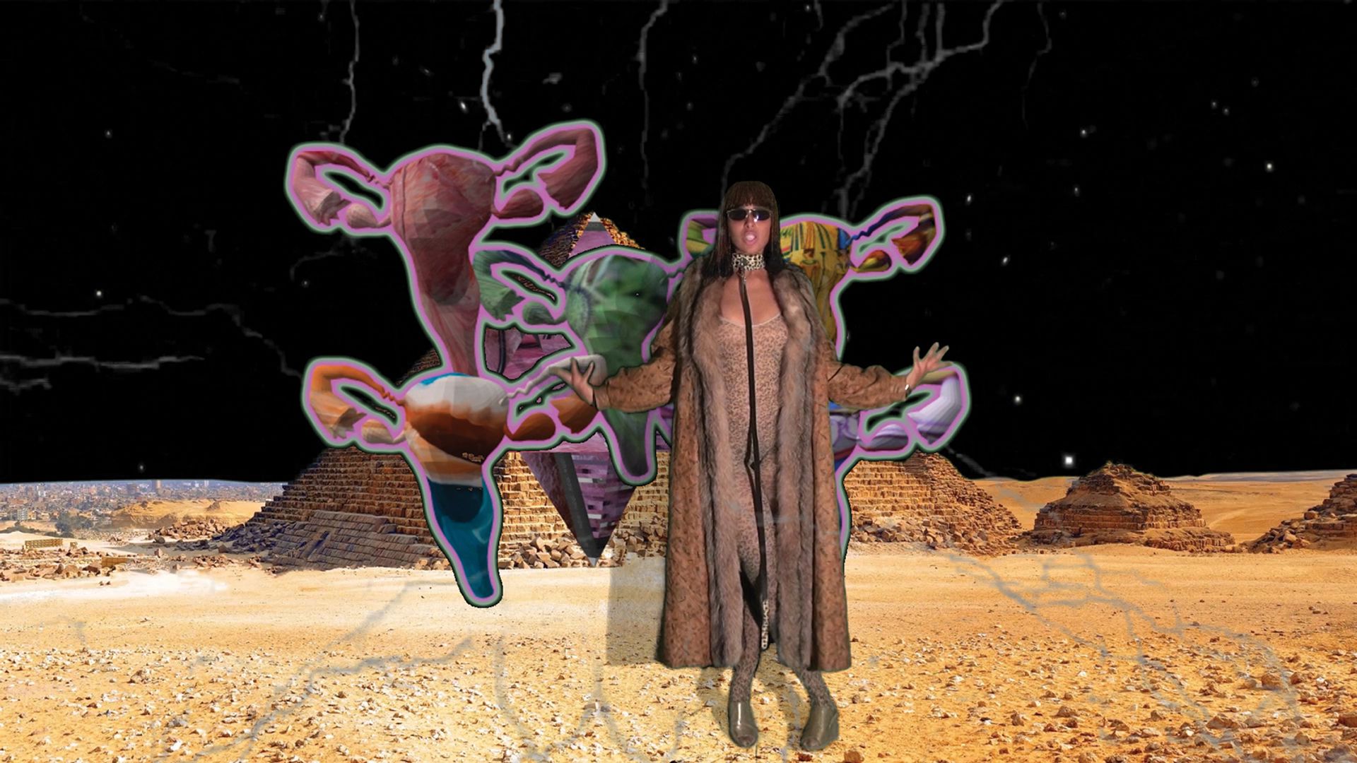 Tabita Rezaire (b. 1989), showing with Goodman Gallery, Johannesburg. The French artist Tabita Rezaire produces digital works and acrylic mounted prints that deal with race and feminism—what she calls “digital healing activism”. Rezaire says the internet, like the world outside, is “exploitative, exclusionary, classicist, patriarchal, racist, homophobic, coercive and manipulative”. Typically featuring herself as the subject, her works are scattered with text like “exotic exhaustion”, “#reparations” and, as she is also a Kemetic yoga teacher, positive affirmations, such as “vibrate the cosmos and the cosmos shall steer the path”. Above, Tabita Rezaire, Hoetep Blessings (2016)