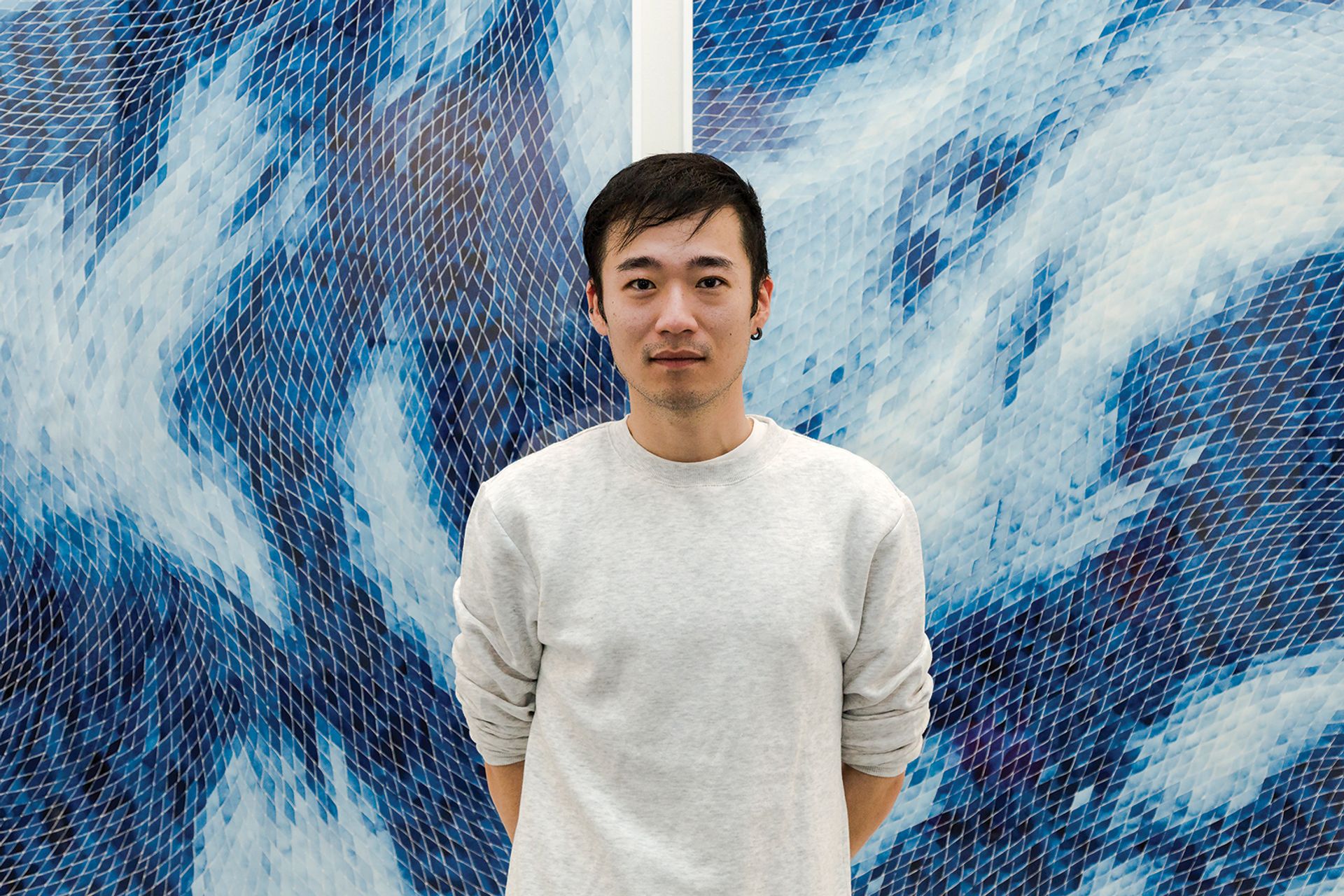 Timothy Hyunsoo Lee (b. 1990), showing with Sabrina Amrani Gallery, Madrid. Originally studying for a career in medicine, the Korean-American Timothy Hyunsoo Lee changed paths after graduation to become an artist and now splits his time working between Seoul, Madrid and New York. This early background can be seen in the repetitive cell-like patterns and precise lines of his work—watercolour paintings, sculptures and neon pieces—but his aim is to explore the spiritual rather than scientific side of the world. Works from Lee's newest series at the Armory are made on gold leaf-covered canvases. Above, the artist with his work “A tremor, a touch, a ripple (han, sun, man, keum)” (2018) Courtesy of the artist and Sabrina Amrani Gallery (Madrid)