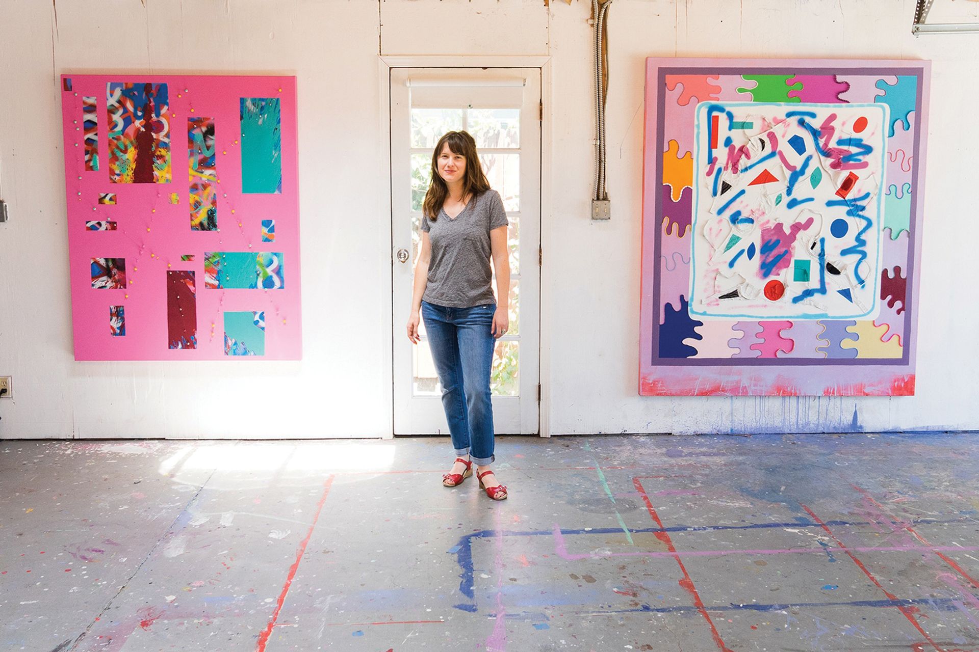Sarah Cain (b. 1979), showing with Galerie Lelong, Paris and New York and Honor Fraser, Los Angeles. Sarah Cain’s feverishly colourful paintings recall work by some of the graffiti-inflected artists of the Bay Area Mission School, and she brings that energy to life with two day painting (2018), an installation at the entrance of Pier 94, which the artist created just before the fair opened as part of its Platform exhibition of large-scale works. A kind of painterly disobedience is essential to the artist’s practice: consider the bold geometric works at Honor Fraser’s booth, painted on dollar bills, music sheets, book jackets and stretcher bars, and her patchwork painting Sky and Sea at Galerie Lelong. © Sarah Cain, Courtesy Galerie Lelong & Co, New York. Photo: David Broach