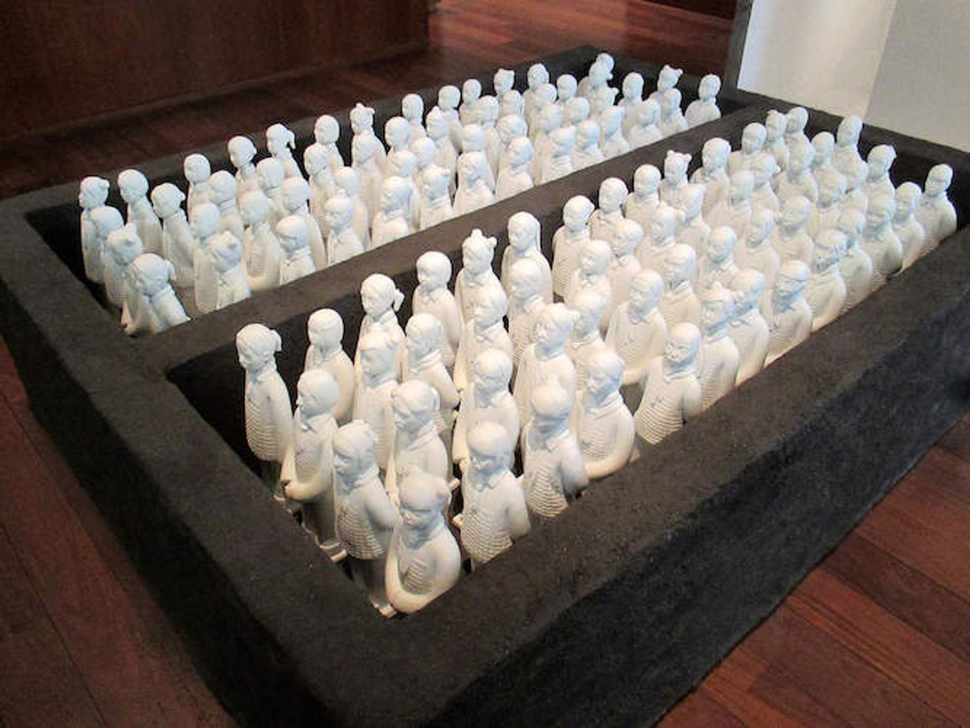 China’s Terracotta Army, an ancient platoon of life-sized warriors, has been on a blockbuster world tour, most recently on show at Philadelphia's Franklin Institute. A miniature version—this one made up solely of female figures—is attracting curious glances at Galerie Daniel Templon on Pier 94. The Paris-born artist Prune Nourry's work explores China’s former one-child policy, abolished in 2015. To create her present-day redux, Nourry photographed eight young girls in rural China, where the policy had the most impact, as infant girls were often rejected and placed in orphanages. According to the gallery, “By combing the eight original moulds with the help of artistan-copyists, Nourry created 108 unique and hybrid terracotta sculptures… reminiscing of all the Chinese girls missing because of gender selection”.