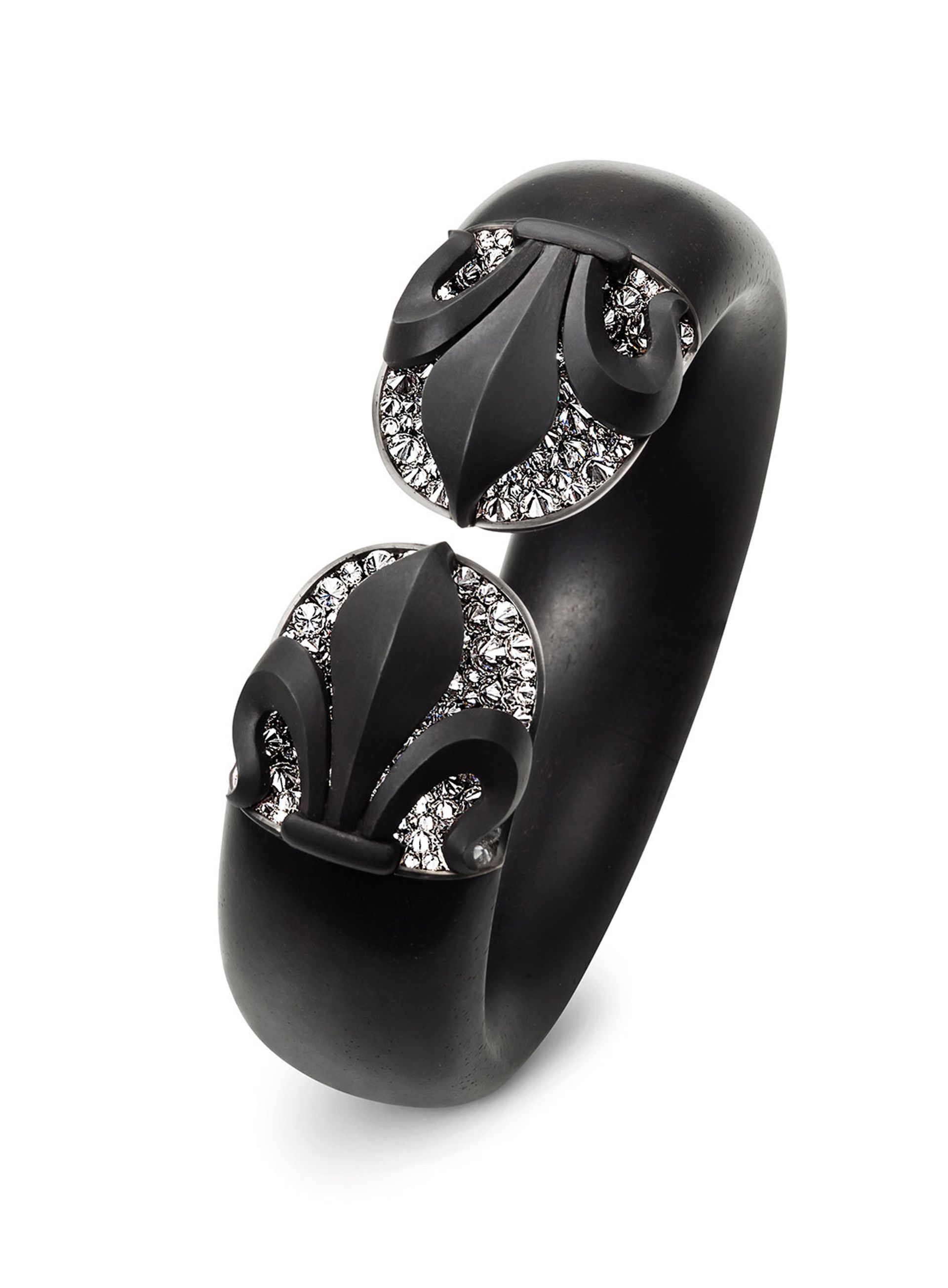 This diamond, ebony, iron, silver and gold bangle is from Hemmerle’s special 125th anniversary collection, which will debut in Maastricht Bernhard Rampf