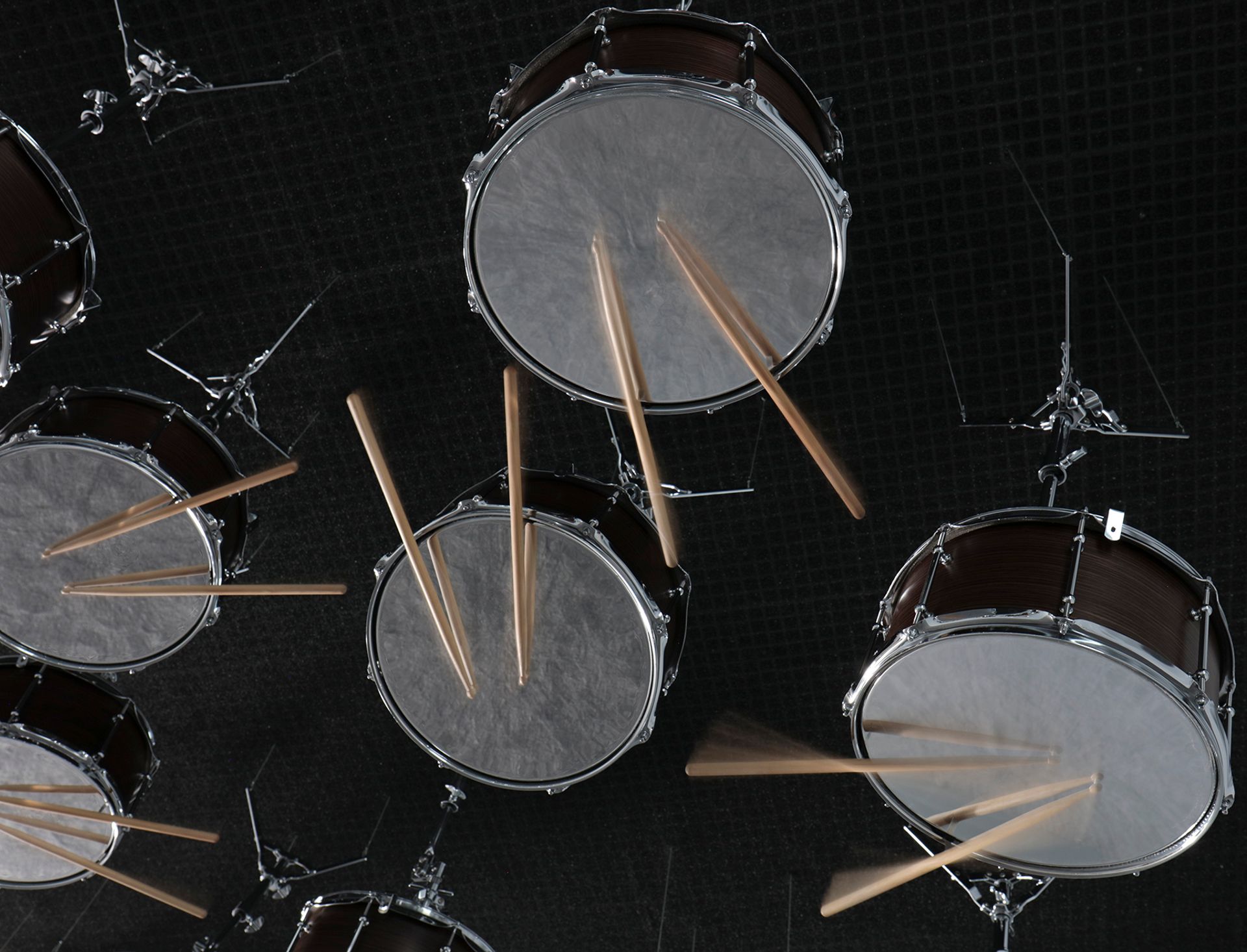 The show also includes The Last Resort, a 42-channel sound installation conceived last year for an outdoor commission from Kaldor Public Art Projects in Sydney, Australia. Self-playing snare drums, which reflected that city and were seemingly affected by wind, now hang from the ceiling of a hushed, carpeted room illuminated by only by a bright, cold movie light. Their drumsticks’ tapping, subtle at first, gradually trigger a full orchestra performing the Adagio from Mozart’s Clarinet Concerto in A Minor.