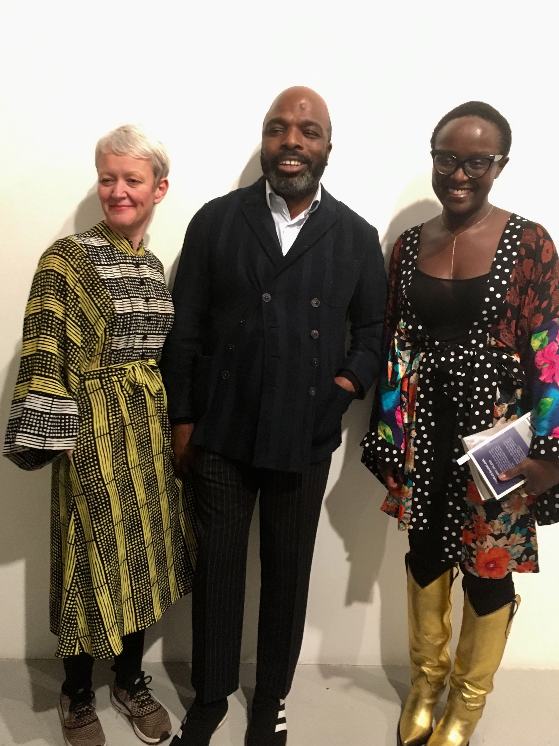 The designer Duro Olowu with the Maria Balshaw and Lynette Yiadom-Boakye, who are both wearing his designs Louisa Buck