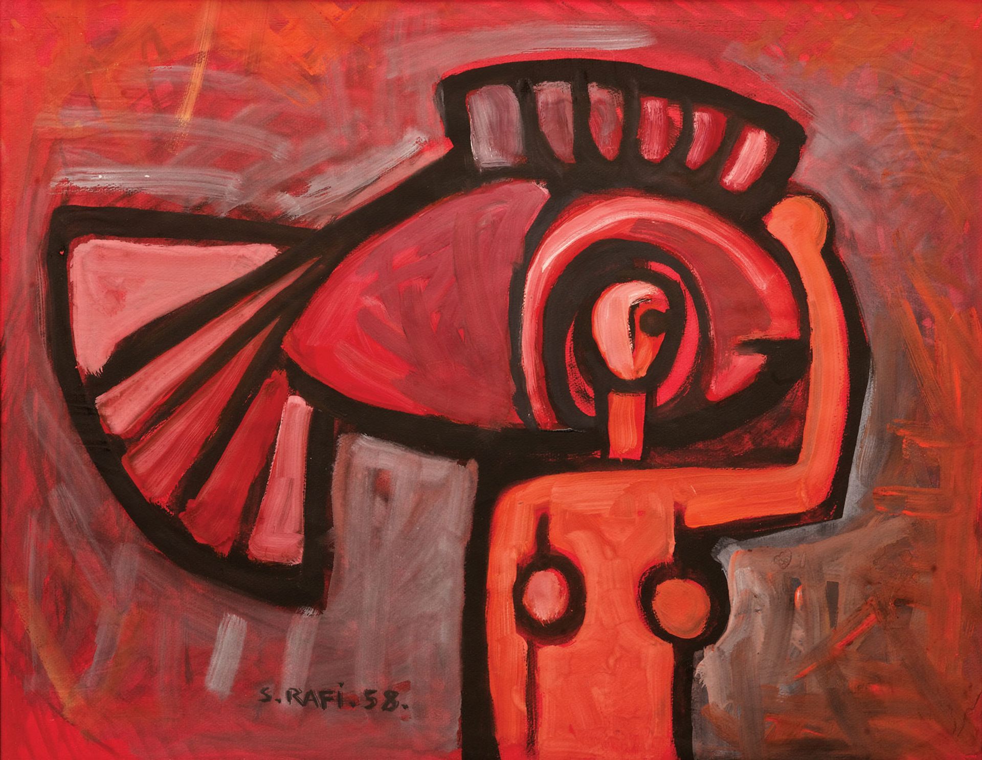 “Throughout all his artistic stages, Rafi showed mastery in line and space. He included elements of geometric abstraction in dark or muted colours compatible with the dream-like Surrealist approach,” a gallery spokesman says. “This took on a melancholic form that set him apart from his contemporaries.”