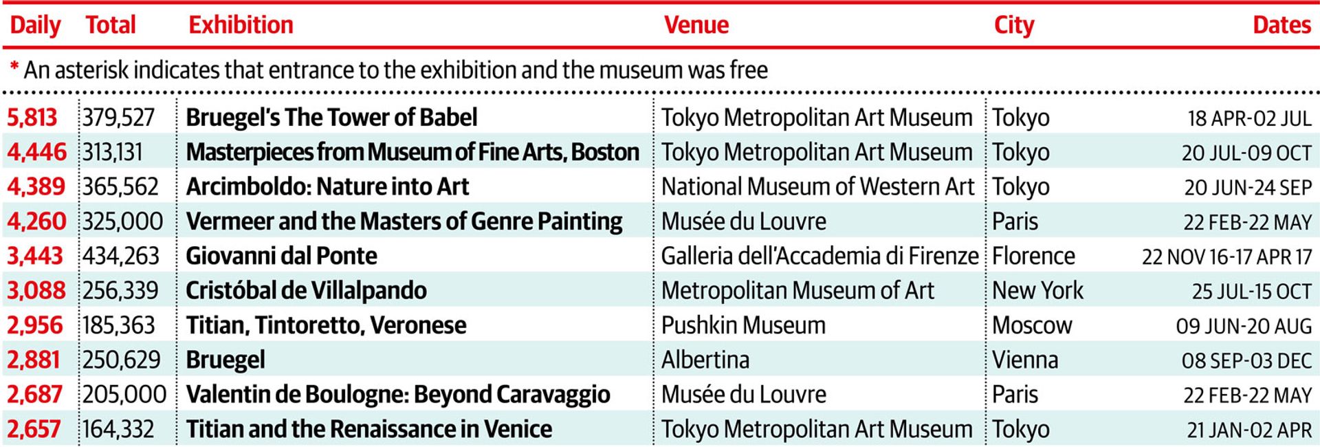One of the joys of the thematic category, which includes exhibitions linked by theme rather than by time period or genre, is that you never know what to expect. In 2017, four exhibitions in our top ten focus on portraits or the human form, from the selfie—an example of 21st-century narcissism at its best—to two decades of photographs of the US President John F. Kennedy and his family. The Saatchi Gallery comes in third with its selfie celebration, which drew 4,693 visitors a day, while 3,732 people a day went to the Smithsonian American Art Museum to see portraits of the people’s president, helping to place the show in fifth position. But the top show was one on the art of the Japanese tea ceremony at the Tokyo National Museum, which had 5,198 visitors a day. A travelling show from the British Museum, A History of the World in 100 Objects, had a respectable showing in Shanghai with 3,627 visitors a day.