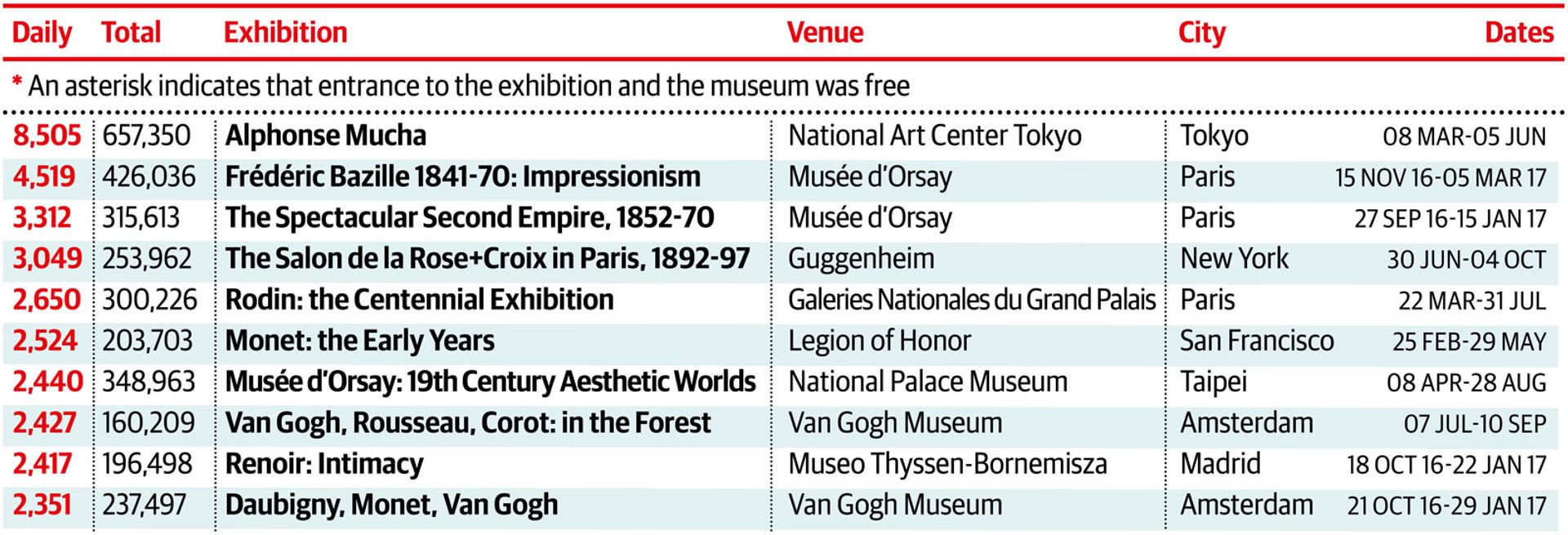 The Czech Alphonse Mucha tops the list that is otherwise dominated by French artists. Instead of his well-known Belle Epoque posters, however, the exhibition in Tokyo focused on the artist’s Slav Epic, a group of 20 canvases, some more than eight-metres tall. The entire cycle had never left the Czech Republic before, and due to the fragility of the works, conservators, as well as the artist’s heirs, tried to stop their export. Nonetheless, the Czech government, which owns the works, chose to send them abroad for a two-year tour of Asia. Mucha’s reputation was revived in the 1960s, a period in which Art Nouveau became popular—a movement that was indebted to Japonisme, something that may account for his show’s popularity in Tokyo. It was in the 19th century that Paris came to be the world centre of art and French painting became synonymous with all that was progressive in art. Even so, the 2017 results here replicate what was once the norm for the top ten: the supremacy of the Impressionists and their offspring. The hegemony of the French Impressionists may also indicate the divide between, on the one hand, academic, multiculturally minded and relativist art historians who insist on canon-busting, and on the other the general public, which can never get enough of the colourful, easy to look at, mentally unchallenging French paintings.