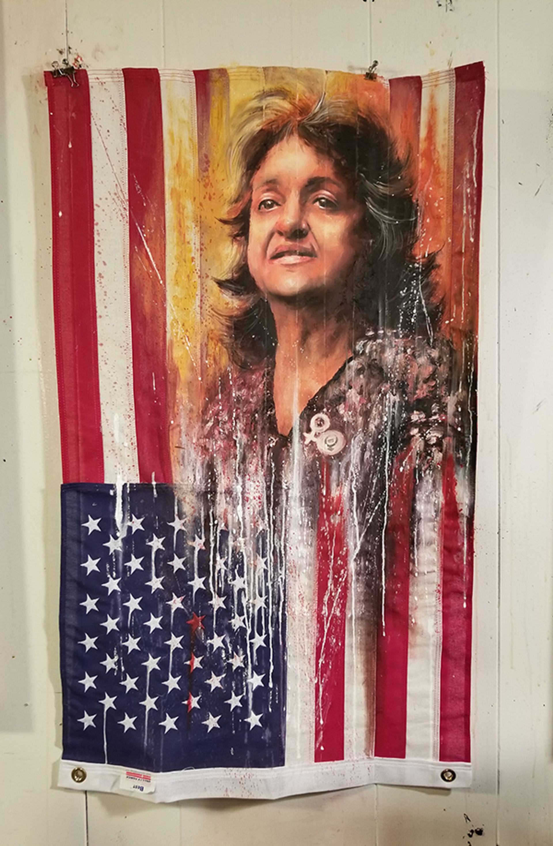 Hanging on the walls surrounding the cell were a series of American flags painted over by other artists like Ann Lewis, Molly Crabapple and Gabe Larson with portraits of activist figures including Malcolm X, Edward Snowden and Angela Davis. These are “greater American revolutionaries, freedom fighters and radicals who fought against tyranny and people like Trump”, says a spokesman of the collective. The flags are due to be shown at Gallery 30 South in Pasadena, California in a month-long exhibition starting 11 April, with proceeds from the show going to benefit arts and social justice charities.