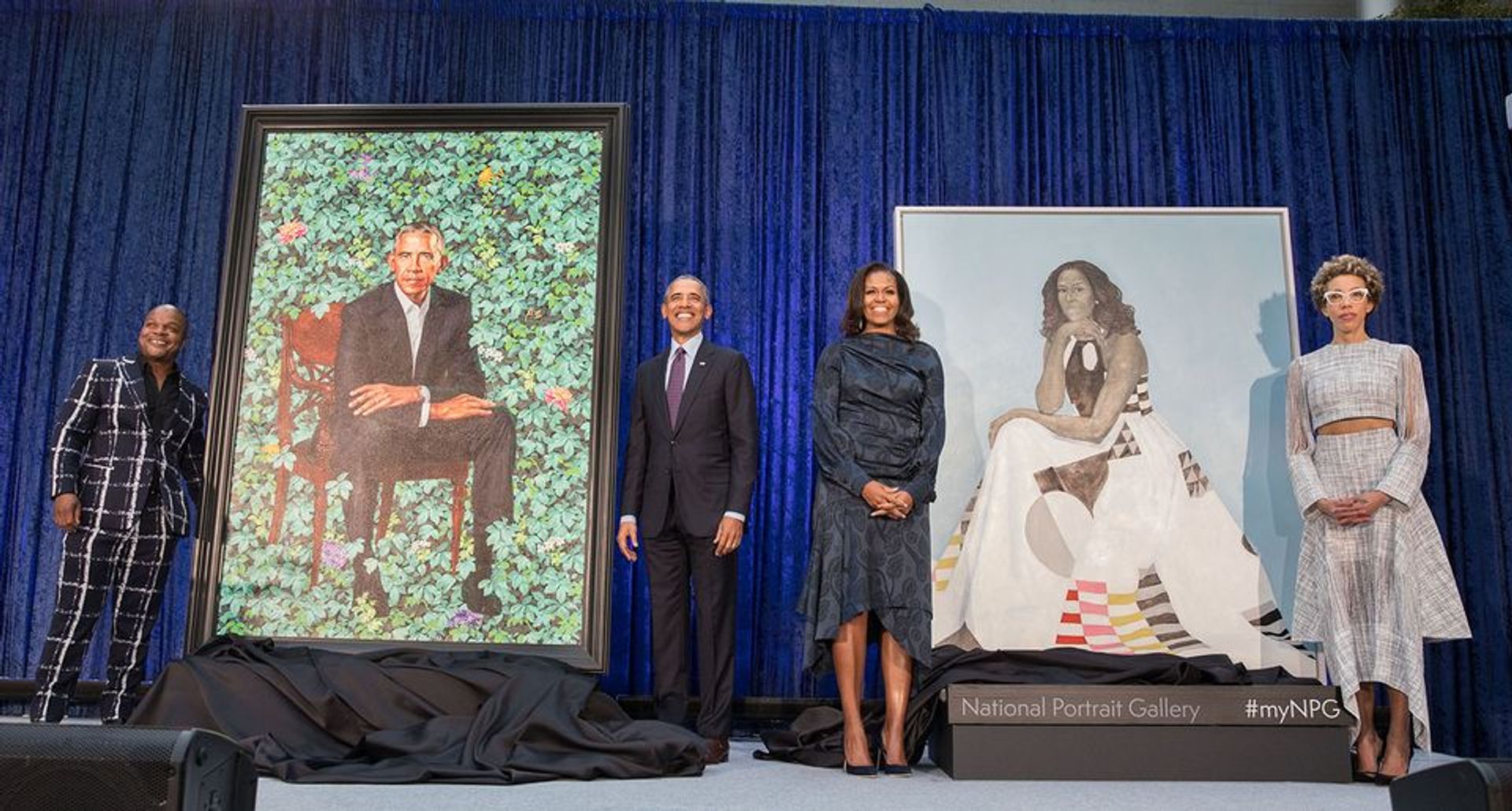 Former President Barack and First Lady Michele Obama (centre) stand with the artists Kehinde Wiley and Amy Sherald in front of their official portraits during a ceremony at the Smithsonian's National Portrait Gallery Pete Souza