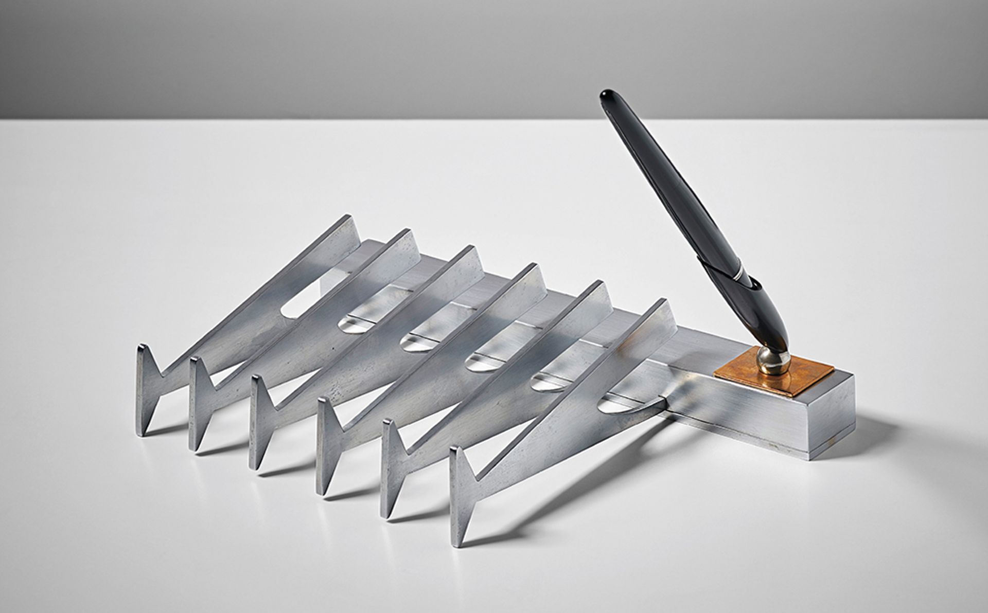 This chromium-plated brass desk set, offered at auction for the first time, is the only known functional work by the Bauhaus artist better known as a painter and photographer. “There are no comparable examples—we gauged its medium value on what a piece of design from this period would be offered for, as well as major works from the Bauhaus and Moholy–Nagy’s sculptures of the same period”, says the auction house’s senior international design specialist in New York, Meaghan Roddy. Moholy-Nagy became an artistic advisor for the Parker Pen company in 1944, traveling from Chicago to Janesville, Wisconsin, for two days out of the month. In 1946, shortly before his death, the artist patented a desk set type “wherein the pen receptacle is [magnetically] secured to a base and is adjustable angularly and rotatively to suit the preference of the user”, according to the patent’s description. It was never put into production. The artist’s wife, Sibyl, included the desk set in the first edition of her book Moholy-Nagy: Experiment in Totality (1950) but its whereabouts were unknown until 2013, when it was rediscovered by the Wisconsin pen collector Susan Wirth. The piece was included in a retrospective of the artist’s work at the Solomon R. Guggenheim Museum of New York in 2016, and travelled to the Art Institute of Chicago and the Los Angeles County Museum of Art. Roddy adds that the Milwaukee Art Museum “has a painting from the artist’s Nuclear series [Nuclear II (1946)] that was gifted to the museum by Kenneth Parker—a nice aside to the artist’s relationship with the manufacturer”.