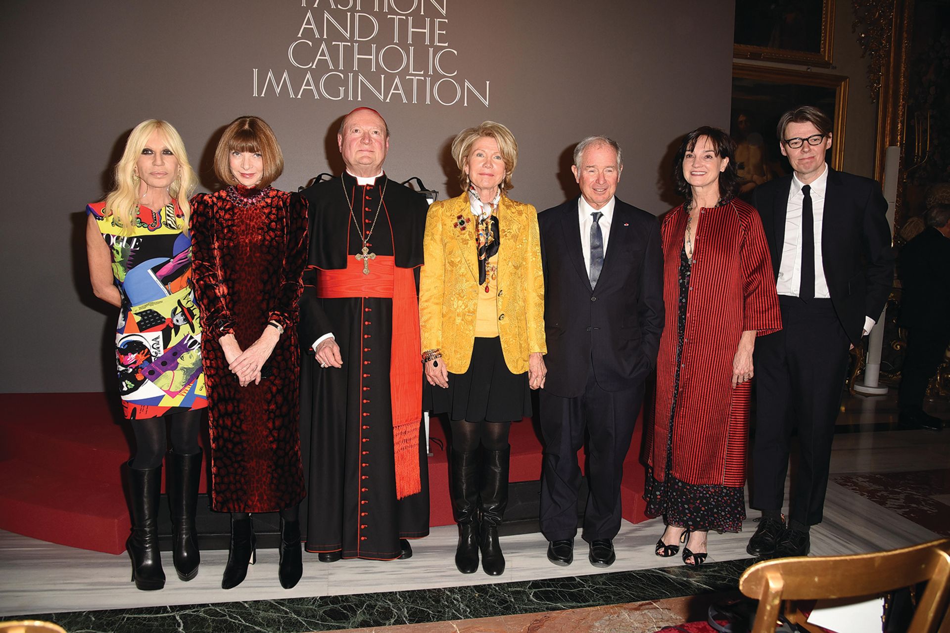 From left: Donatella Versace, Anna Wintour, Cardinal Gianfranco Ravasi, Christine Schwarzman, Stephen A. Schwarzman, Carrie Rebora Barratt, and Andrew Bolton at The Met’s Heavenly Bodies: Fashion and the Catholic Imagination press preview in Rome Courtesy of The Metropolitan Museum of Art/@sgpitalia