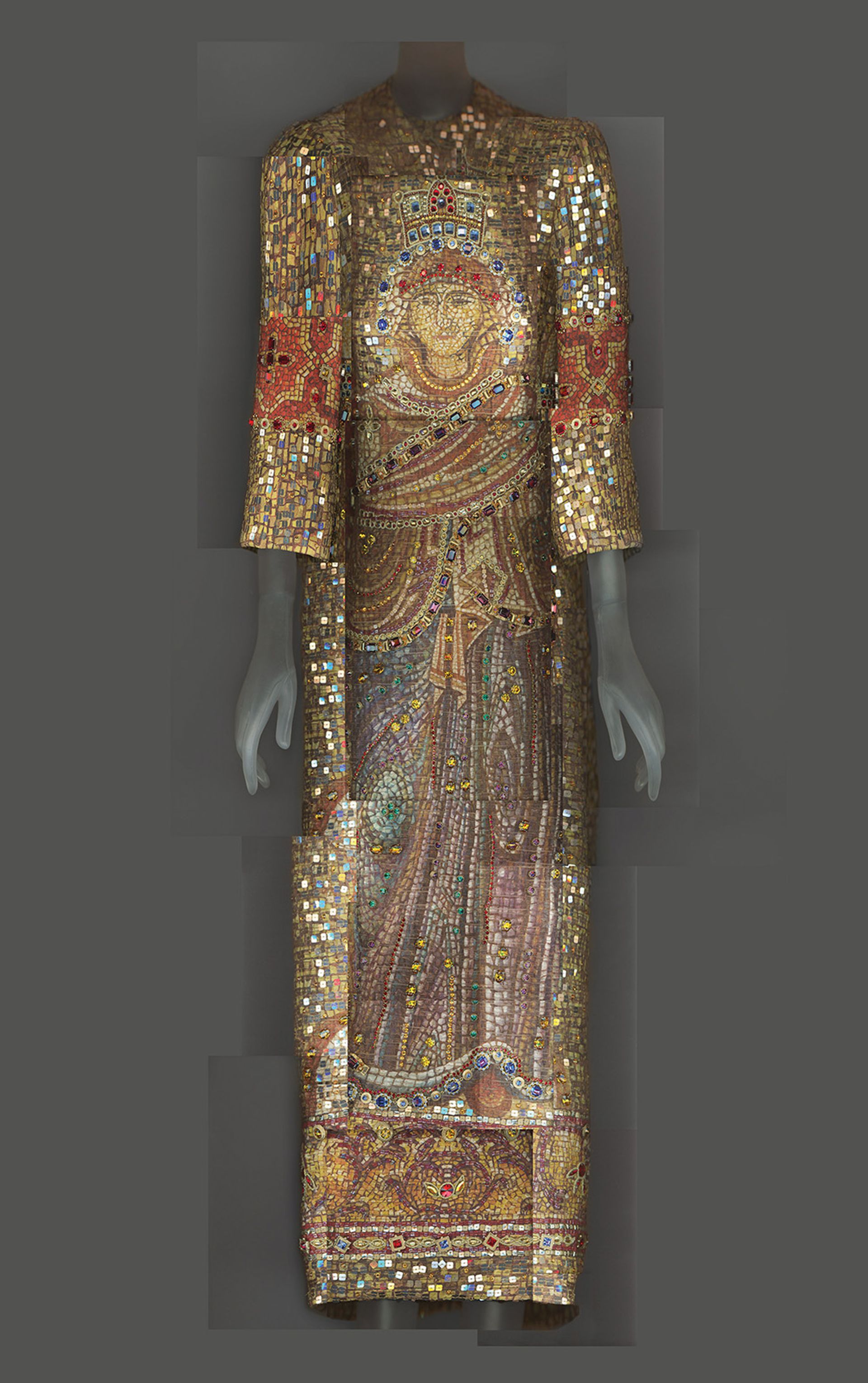 “Gianni Versace’s use of religious imagery highlighted its ubiquity in popular culture, especially the cross, a defining decorative element of Versace’s final collection,” the exhibition catalogue states, including a series of garments made from a specially developed metal-mesh “that draped and clung to the figure like bias-cut silk but also resembled mail”. One example is a gold evening dress bisected from neck to hem by a large cross, based on a Byzantine gilt-silver processional cross from the Met’s collection.