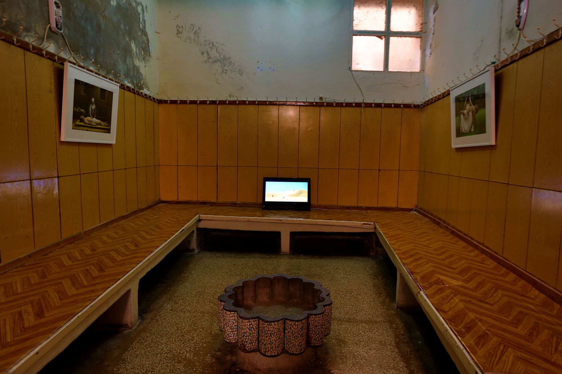 In a disused bathhouse, CANAN has hung delicate tulle tapestries embroidered with animals, including the locally revered peacock, whose shadows dance across marble walls. They are accompanied by music emitted from the adjacent room in photographer Youssef Nabil’s installation You Never Left, in which the death of a man is an allegory for exile from Egypt.