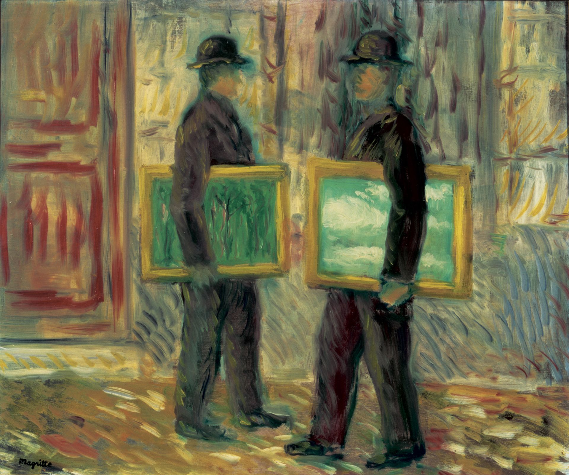 As a response to this problem, Magritte entered what is known as his Sunlit Surrealist or Renoir period (1943–47). Works such as The Fifth Season (1943)—two bowler-hatted men with paintings under their arms—look less like Magrittes than pastiches of Impressionism. He followed with his short-lived Vache period (1948), during which he made vigorous, unruly paintings that owed much to German Expressionism.