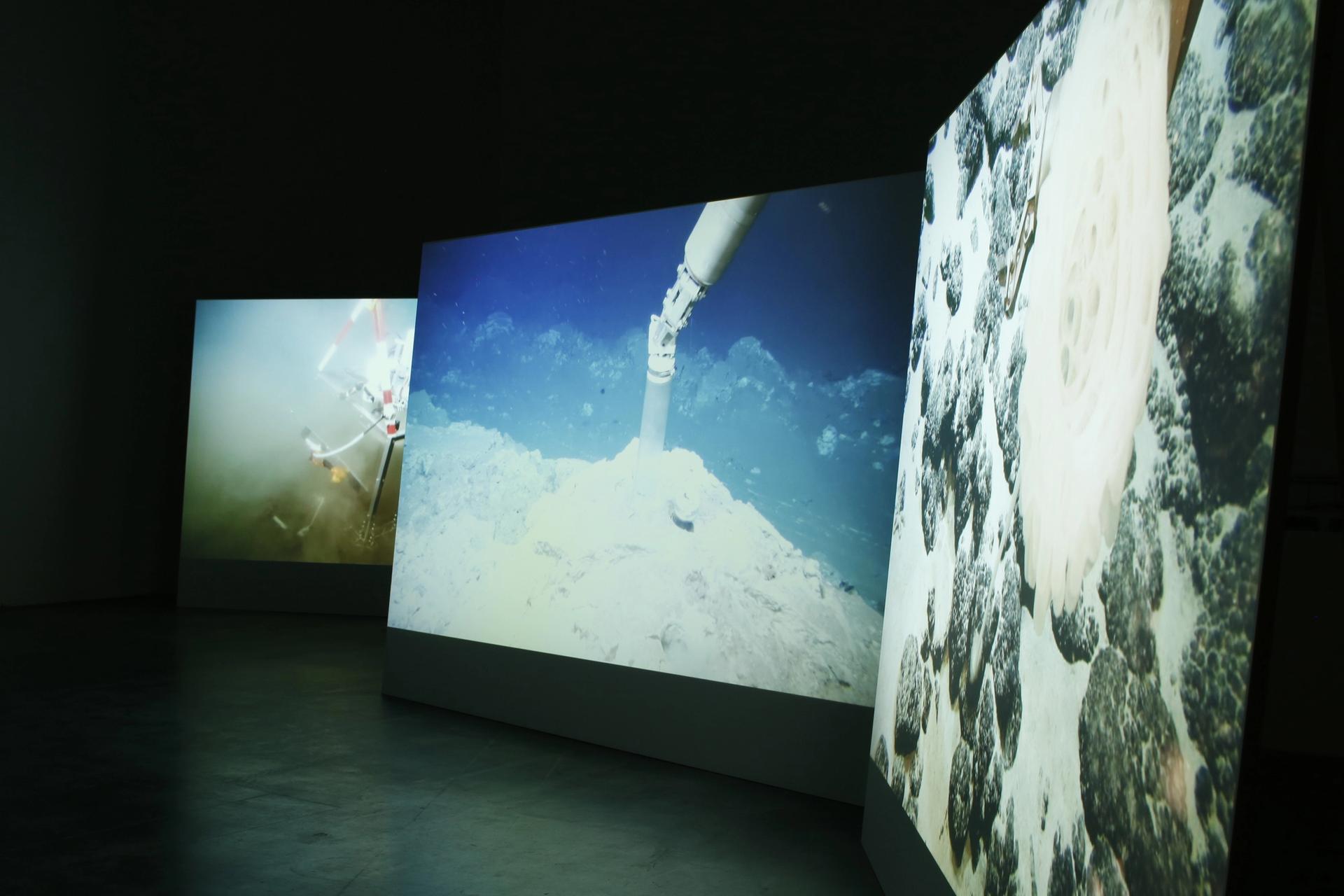 Installation view of the exhibition Oceans - Dialogues between ocean floor and water column (2017) at Edith-Russ-Haus for Media Art in Oldenburg, a previous excerpt iteration of the Prospecting Ocean show Photo: Armin Linke