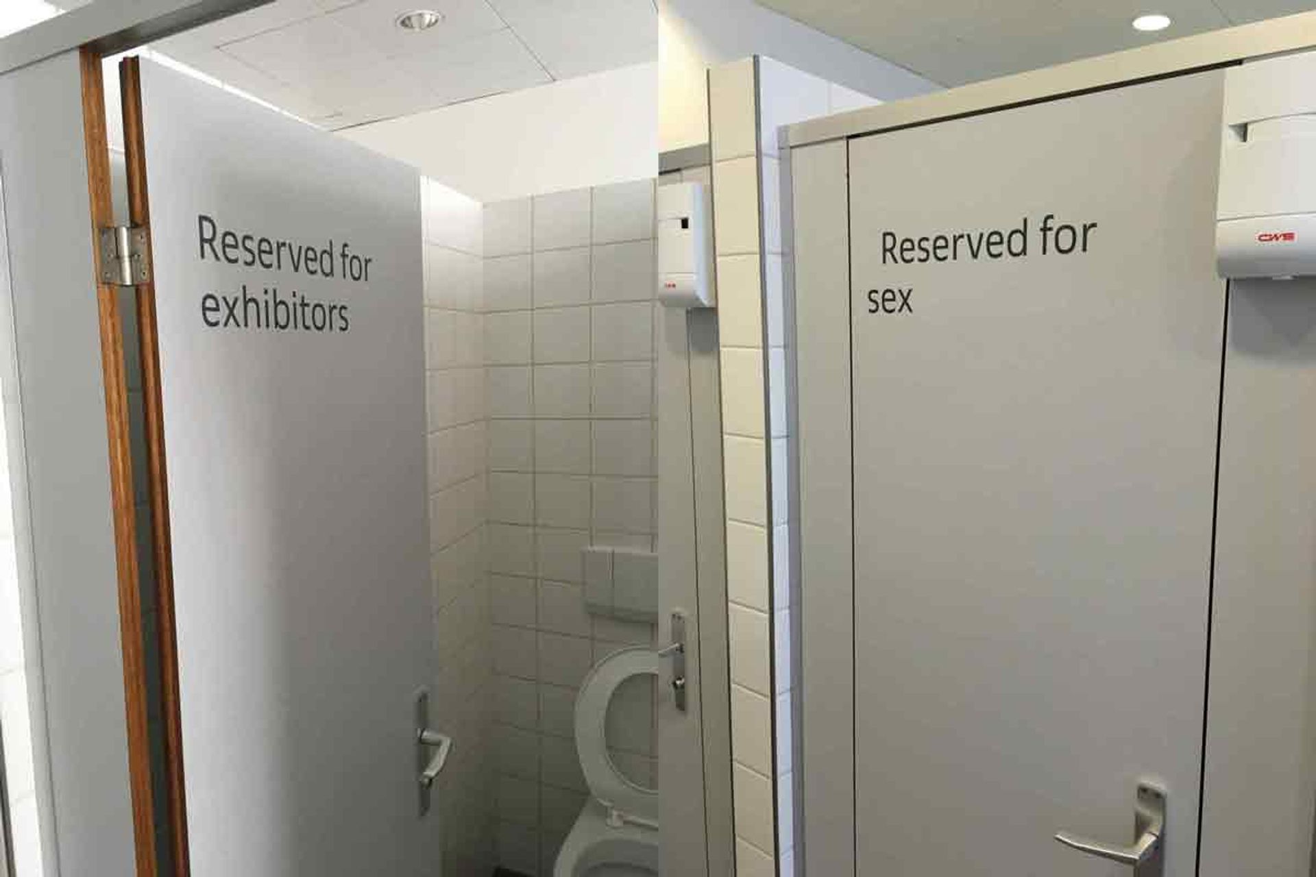 Keeping with today’s scatological theme, the toilets in the main fair have a cubicle reserved especially for exhibitors, lest the collectors and the public occupy all the stalls, leaving exhibitors cut short when they need to take a comfort break. But during yesterday’s installation at Art Basel—when technicians, dealers and artists were hard at work—someone had cheekily customised one of the cubicles for another type of, shall we say, activity.