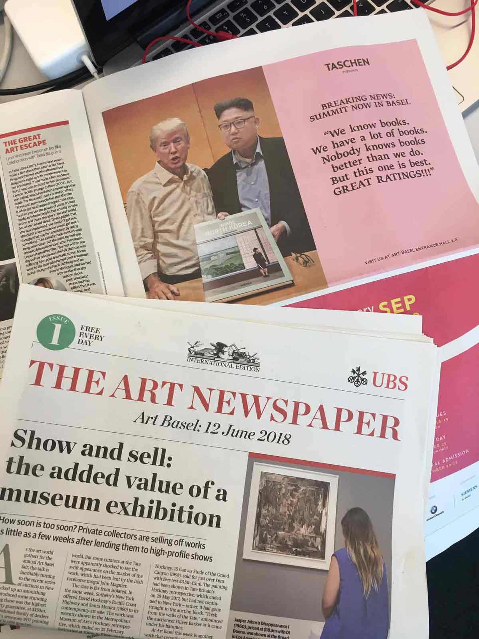 Visitors to Art Basel this week may also have noticed that a major political summit is taking place on the other side of the world. (We’re talking about Donald and Kim’s love-in at a Singapore hotel, of course.) The Cologne-based art book publisher Taschen is putting its own spin on the historic talks via the book Inside North Korea by the Guardian critic Oliver Wainwright, available at its Art Basel stand. The two leaders look considerably thinner in Taschen’s advertisement, which appeared in these pages earlier this week; Donald must have ditched the burgers in bed while Kim has evidently forsaken his cheese treats. (The North Korean bigwig was apparently once hooked on Emmental.)