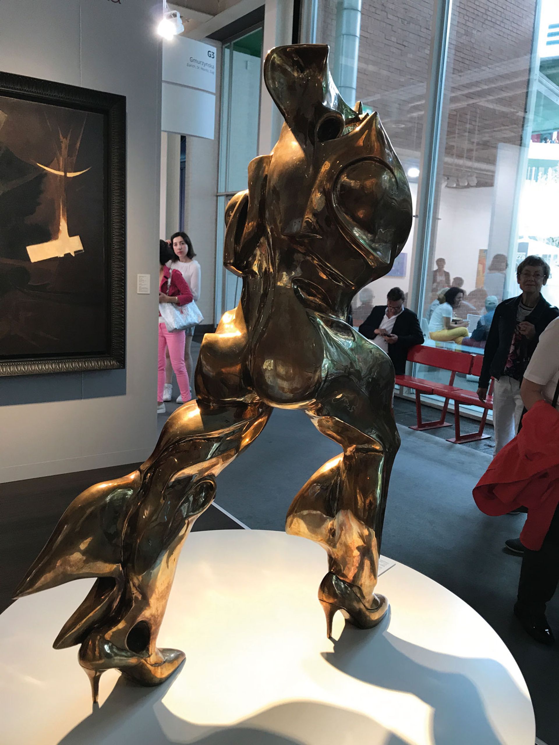 The award for the best take on a famous art historical work at Art Basel goes to the Italian artist Francesco Vezzoli, who has transformed a 1913 Futurist sculpture by giving it… a pair of high heels. When Umberto Boccioni made Unique Forms of Continuity in Space, epitomising the Futurist ethos of speed and motion, he said: “Let us fling open the figure and let it incorporate within itself whatever may surround it.” Vezzoli’s version has rather less panache, striding on the stand of Galerie Gmurzynska like a colossus on stilettos. “I just wanted to bring a touch of camp to one of one of the most famous pillars in the history of Italian sculpture,” he says.