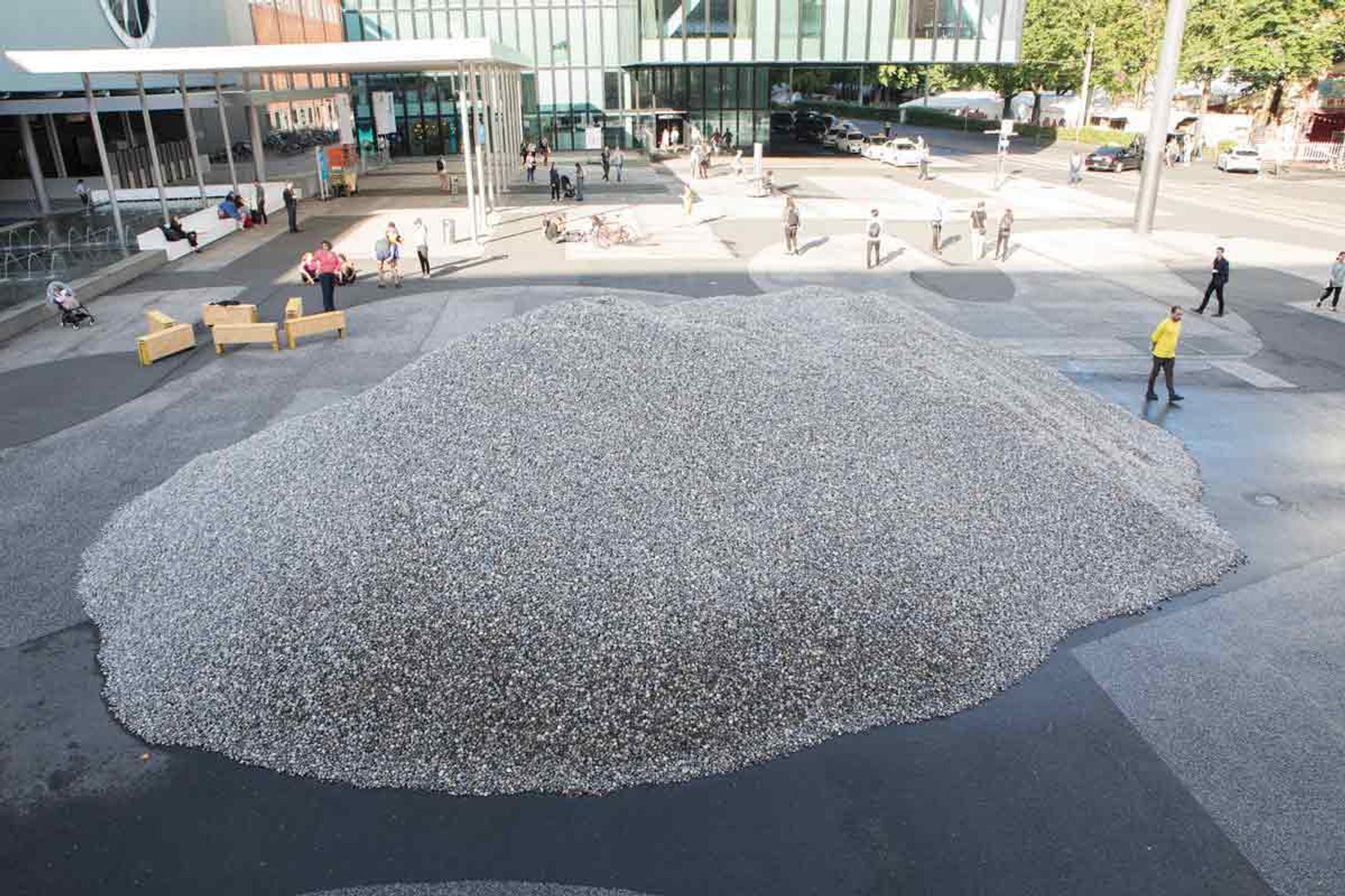 It’s hard to miss the mountain of pebbles piling up on the Messeplatz. The gravel installation, by the Spanish artist Lara Almarcegui is, increasing in size throughout the fair to reflect the amount of material extracted from Basel quarries during this period. Despite the work’s serious subject matter, collectors were seen pocketing the rocks as souvenirs as though they were Félix González-Torres’s sweets. After hours earlier in the week when the mountain was more of a large mound, one cheeky fairgoer spotted an opportunity to show off his athletic prowess by running to the top and performing a bear slide down it worthy The Jungle Book’s Baloo. Another chose to make his decent by the less desirable slide and roll technique. Their excitement at conquering Mont Messeplatz was short-lived when the smartly dressed pair saw the state of their clothing after their expedition.